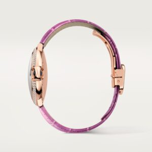 Ballon Bleu de Carthttier watch, 36 mm, mechanical movement with automatic winding. Rose gold 750/1000 case set with 123 brilliant-cut diamonds totaling 1.22 carats. Fluted crown set with a cabochon sapphire. Silver guilloché lacquered opaline dial. Blued-steel sword-shaped hands. Sapphire crystal. Purple alligator leather strap, rose gold 750/1000 interchangeable deployant buckle. Case thickness: 12.1 mm. Water-resistant up to 3 bar (approx. 30 meters/100 feet).
