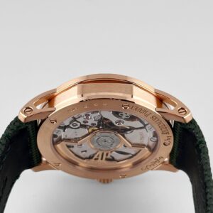 The green lacquered dial features a sunburst pattern that shifts beautifully with the light, complemented by applied gold hour markers and hands. Paired with a matching green strap and equipped with a date window at 3 o’clock, this automatic timepiece blends contemporary elegance with traditional craftsmanship in one of the most modern expressions of Audemars Piguet’s design ethos.