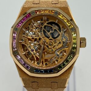 This Double Balance Wheel is crafted in a 18k frosted rose gold 37mm case enriched with a bezel set with “rainbow” baguette-cut multicoloured gemstones. The rose gold-toned openworked dial features rose gold applied hour-markers and Royal Oak hands with luminescent coating. The watch comes on a hammered 18-carat rose gold bracelet with AP folding clasp.