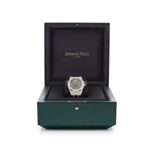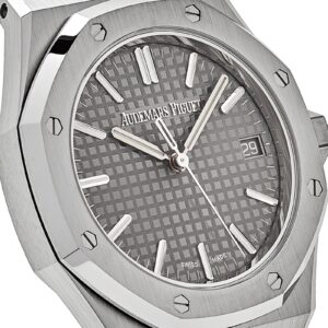 This 15550ST.OO.1356ST.03 ’50th Anniversary’ is crafted in a stainless steel case measuring 37mm. The grey dial features the “Grande Tapisserie” pattern with white gold applied hour-markers and Royal Oak hands with luminescent coating.