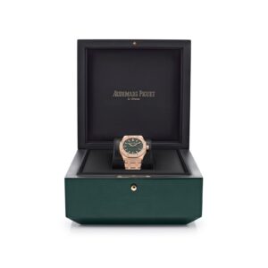 The khaki green dial, decorated with the iconic Grande Tapisserie pattern, provides a bold yet elegant aesthetic. Rose gold applied hour markers and luminescent Royal Oak hands ensure perfect legibility while complementing the case. The integrated rose gold bracelet, renowned for its seamless construction and comfort, enhances the watch’s sophisticated appeal.