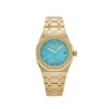 The Audemars Piguet Selfwinding is designed in a 41mm stainless steel case and styled on a matching bracelet. The smoked burgundy dial hosts white gold stick hour markers and hands. At 6 o’clock sits the skeleton view of the watches tourbillon complication. A sapphire crystal protects the exhibition case back, offering a glimpse into the movement powering the Flying Tourbillon and basic timekeeping functions.
