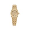 Its grey dial with the signature “Petite Tapisserie” pattern is paired with white gold hands and hour markers for a refined, monochromatic look. Powered by a quartz movement and fitted with a matching frosted gold bracelet, this ultra-compact Royal Oak blends jewelry-level craftsmanship with iconic design in a bold, modern mini format.