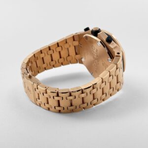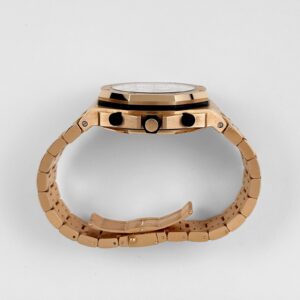 The Audemars Piguet Chronograph 26170OR.OO.1000OR.01 pairs boldness with refinement in full 18-carat rose gold. Its 42mm case and integrated bracelet give it substantial wrist presence, while the white Méga Tapisserie dial offers a clean look with white subdials and prominent Arabic numerals for sharp legibility. The signature Royal Oak octagonal bezel is secured with exposed screws, reinforcing its sport-luxury appeal.