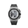 The Audemars Piguet Chronograph 26470PT.OO.1000PT.01 elevates the Offshore series with a full 42mm platinum case and bracelet—a rare and substantial expression of the collection’s boldest design codes. Its grey “Méga Tapisserie” dial is complemented by black subdials, creating a sophisticated aesthetic that amplifies the presence of the platinum case.