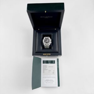 This reference features a screw-down crown and pushers, as well as an exhibition caseback, showcasing the automatic chronograph movement within. The sheer weight of platinum, combined with the refined yet muscular profile of the Offshore, makes this piece a grail for those seeking exclusivity and heft in equal measure. It’s a statement of both technical mastery and audacious luxury.
