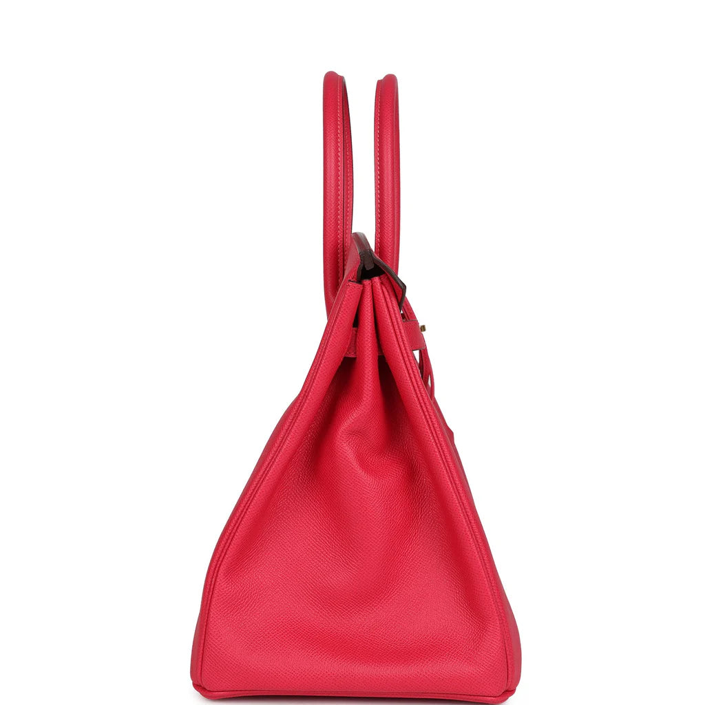 This Birkin is in Minium togo leather with palladium hardware and hastonal stitching,front flap, two straps withcentertoggle closure, clochette with lock and two keys, and double rolled handles.