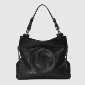 The Round Interlocking G that characterizes the Guthtcci Blondie line originates from the House archives. Signature pieces such as this Guthtcci Blondie tote bag with a top handle and chain shoulder strap reinterprets the emblem as a subtler leather patch detail.