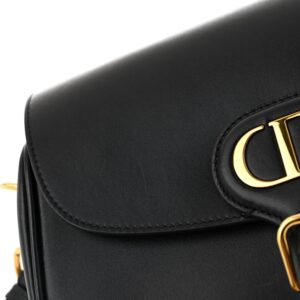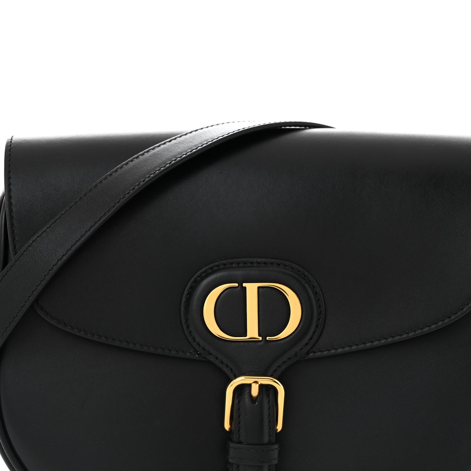This is an authentic CHRISTIAN DIOR Box Calfskin Medium Bobby Flap in Black. This flap bag is finely crafted of black leather. The bag features an adjustable shoulder strap and polished gold hardware. The flap opens to a black suede interior with a leather pocket.