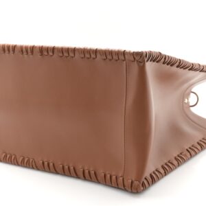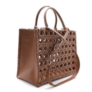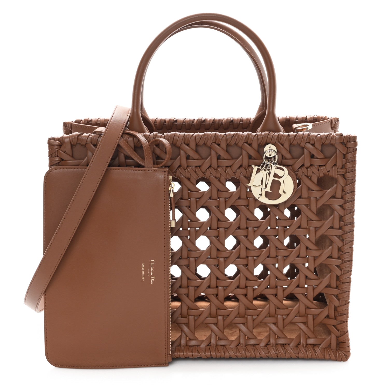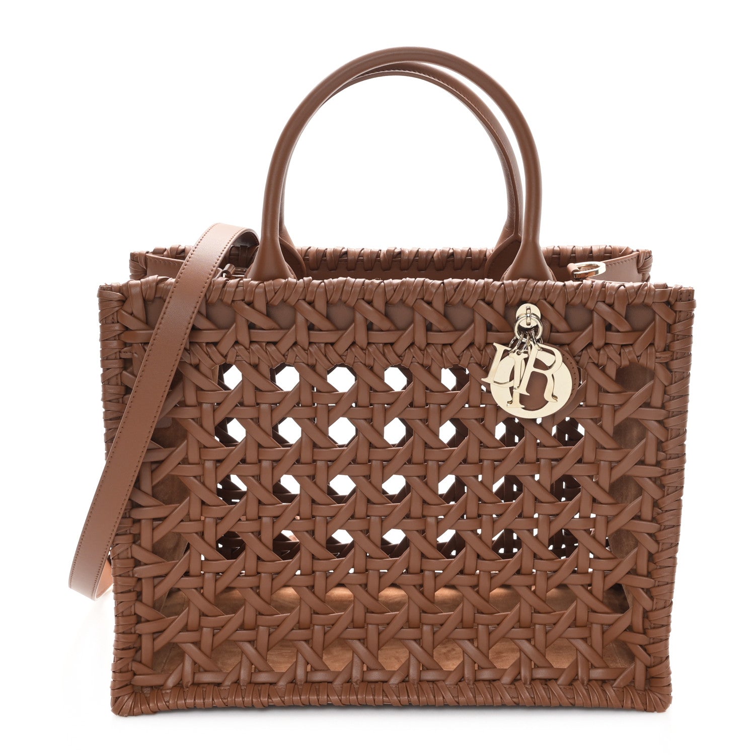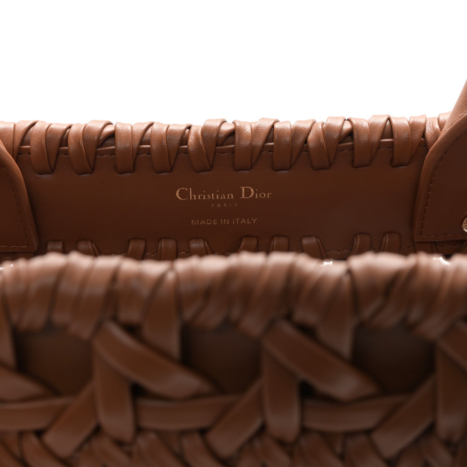 This is an authentic CHRISTIAN DIOR Calfskin Braided Cannage Medium Book Tote in Golden Saddle. This tote is crafted of the braided cannage leather in golden brown. The bag features leather rolled top handles, an adjustable leather strap and gold hardware. The top opens to a spacious suede interior with a removable poch
