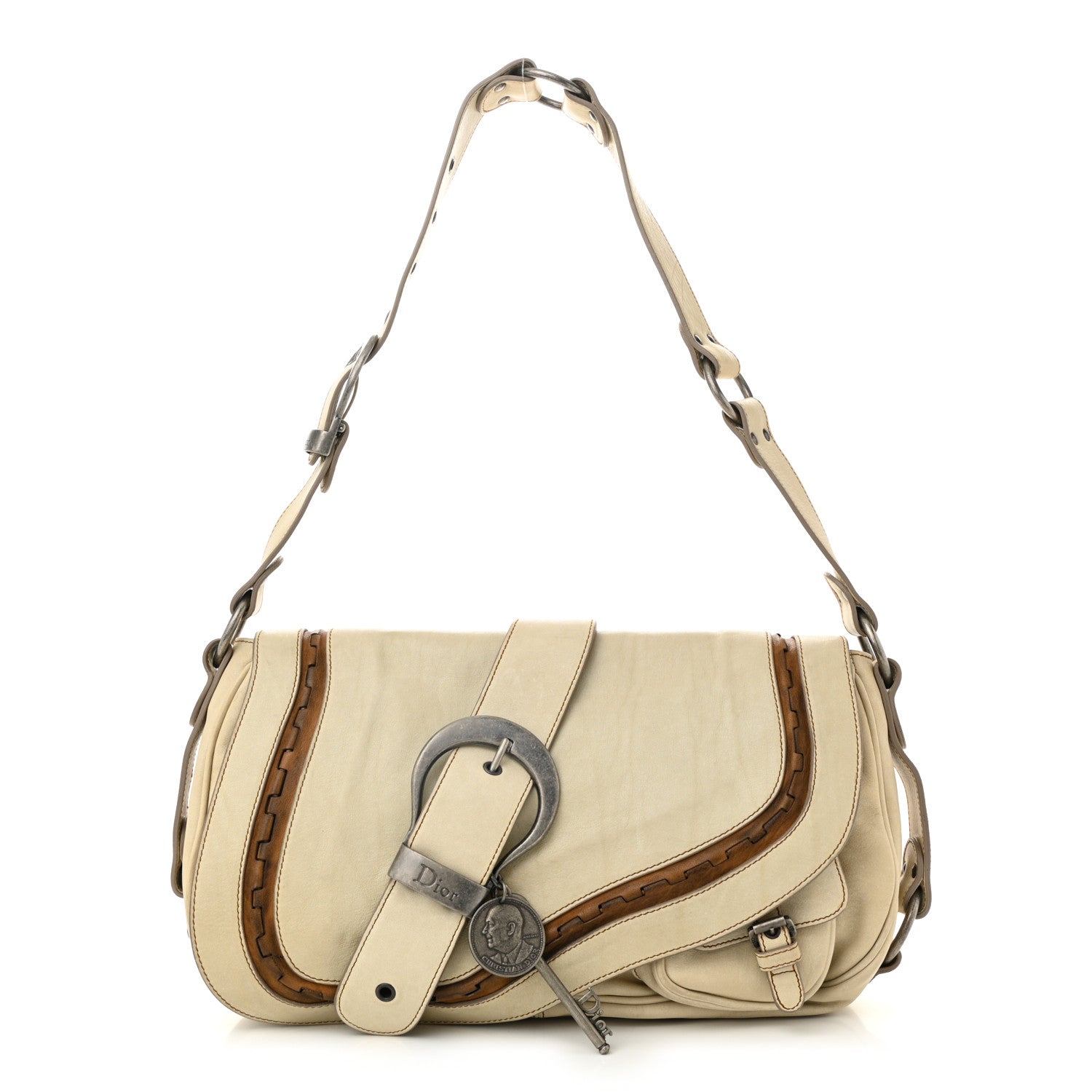 This is an authentic CHRISTIAN DIOR Calfskin Medium Gaucho Double Saddle Bag in Ivory. This shoulder bag is crafted of supple washed calf leather which is folded over to represent a true saddle shape. The bag features lambskin trim and contrast topstitching along with perfectly accenting antiqued silver metal hardware. The frontal flap opens to a brown Dior monogram jacquard fabric interior with a zipper pocket.