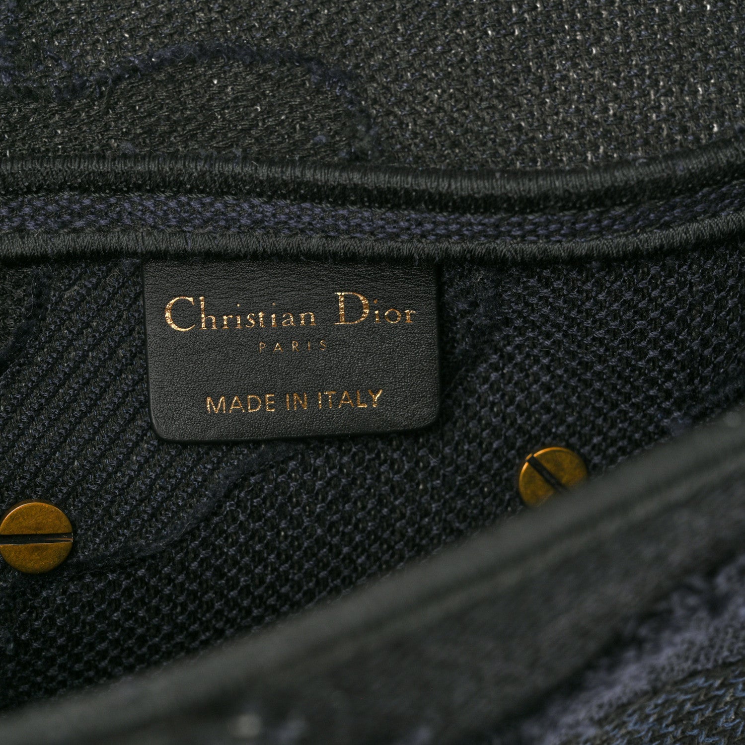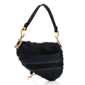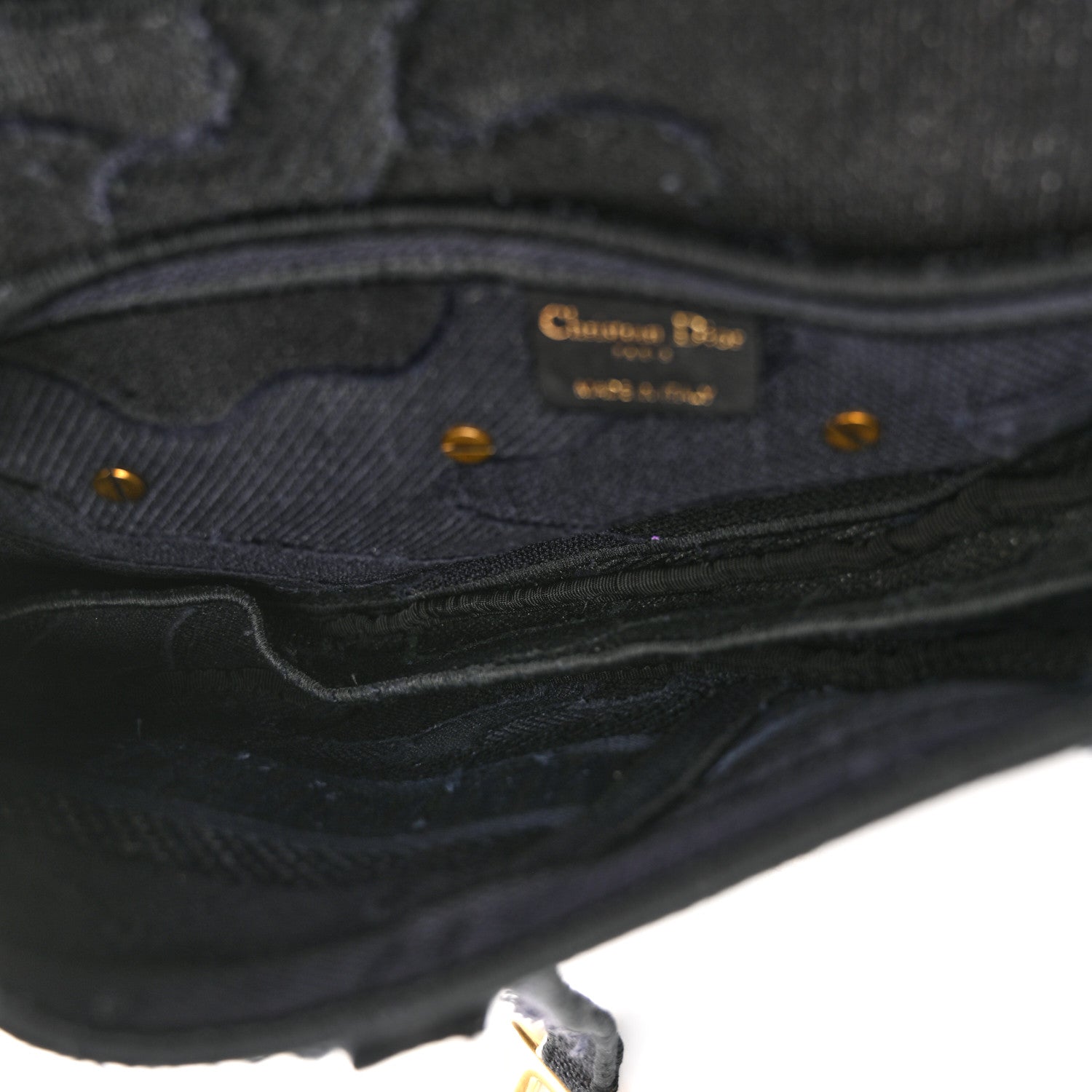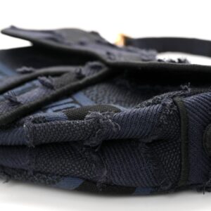 This is an authentic CHRISTIAN DIOR Canvas Embroidered Camouflage Saddle Bag in Blue. This saddlebag is made of embroidered camouflage canvas in navy blue with the Christian Dior logo across the front. The flap sports a brass Dior D charm and opens to a matching fabric interior.