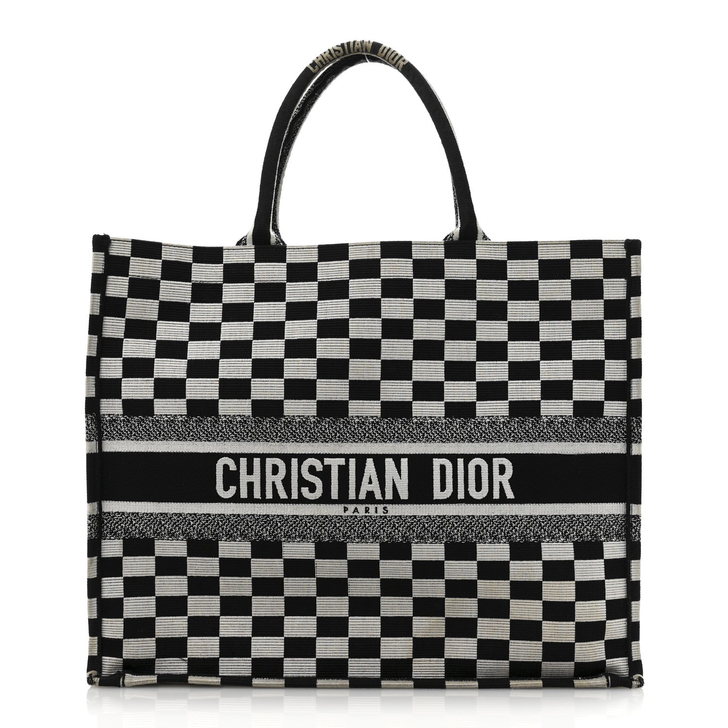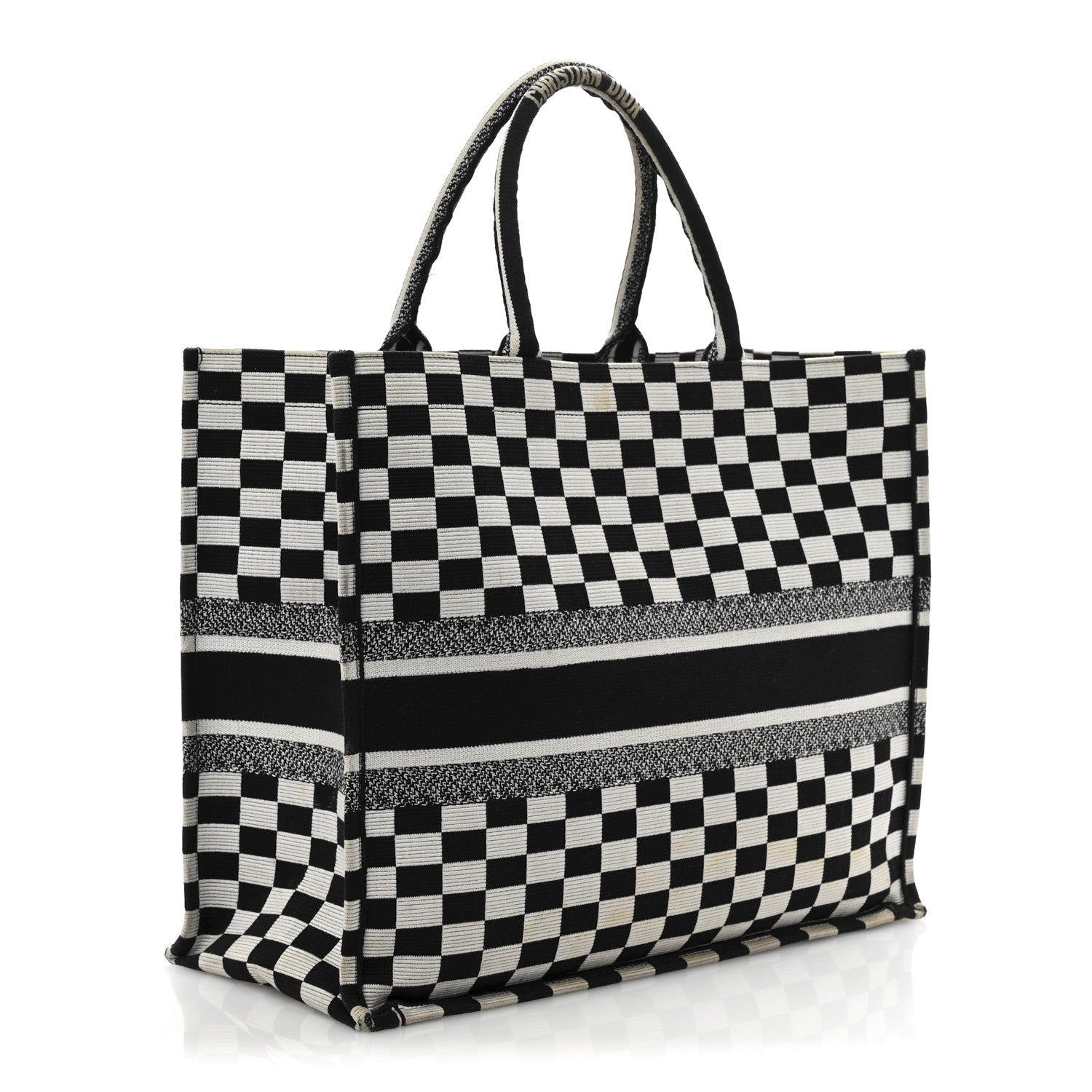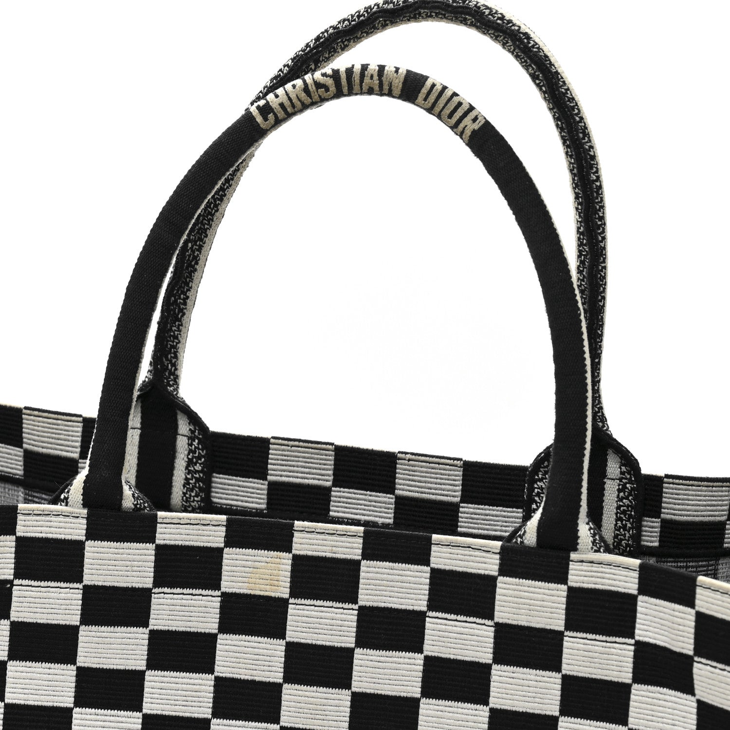 This is an authentic CHRISTIAN DIOR Canvas Embroidered Checkered Book Tote in Black and White. This tote is crafted of checkered canvas in black and white. It features black canvas rolled top handles with CHRISTIAN DIOR embroidery and opens to a spacious fabric interior.
