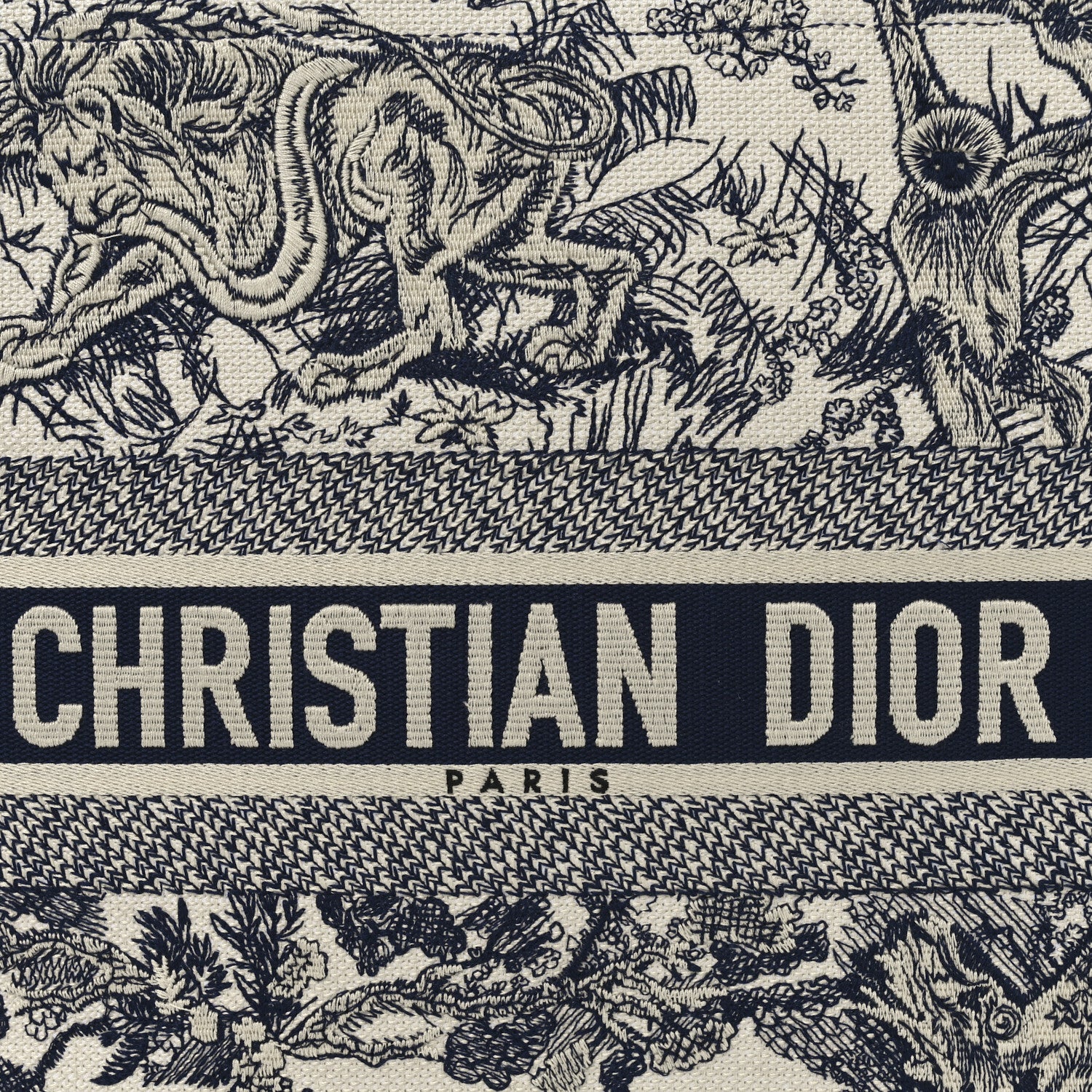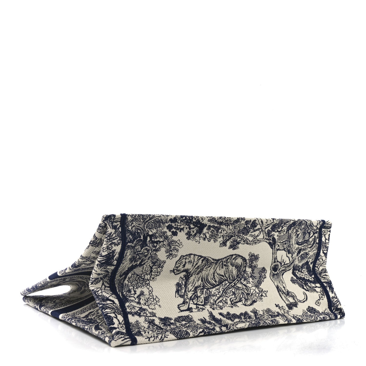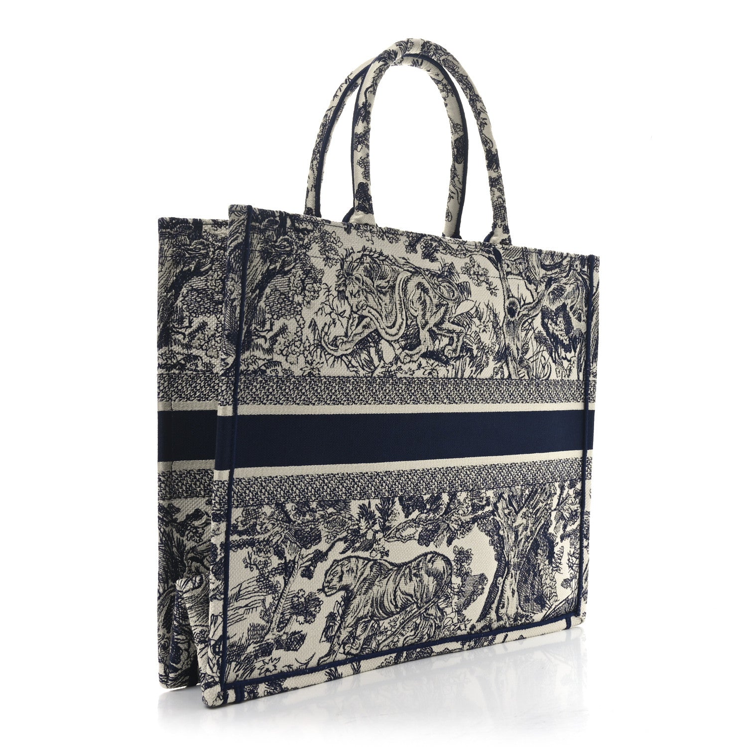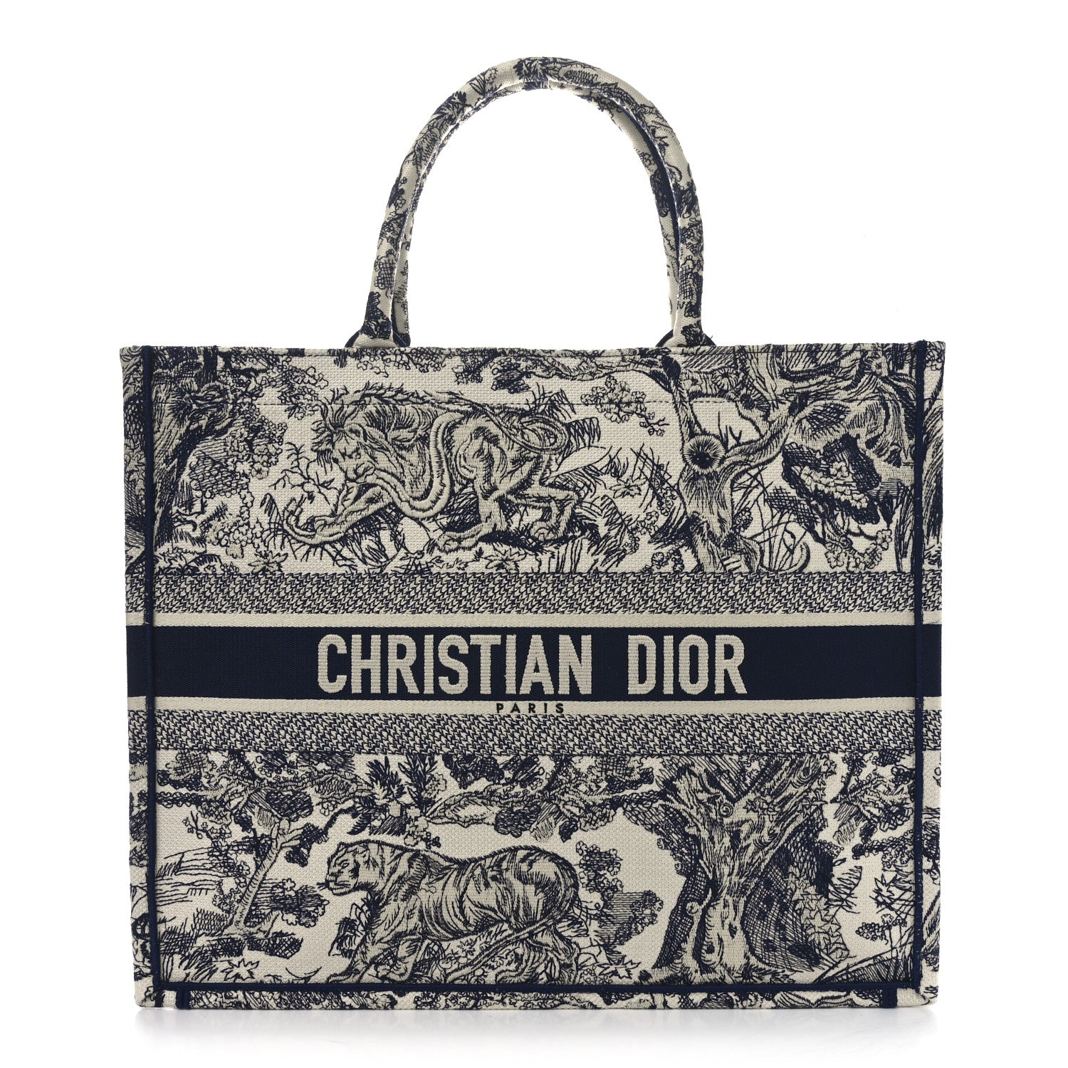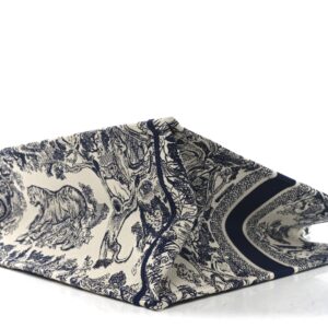 This is an authentic CHRISTIAN DIOR Canvas Embroidered Large Dioriviera Toile De Jouy Book Tote in Blue. This colorful tote is finely crafted of embroidered canvas with a bold jungle graphic in dark blue. The bag features matching canvas rolled handles, with the CHRISTIAN DIOR logo embroidered across the front.