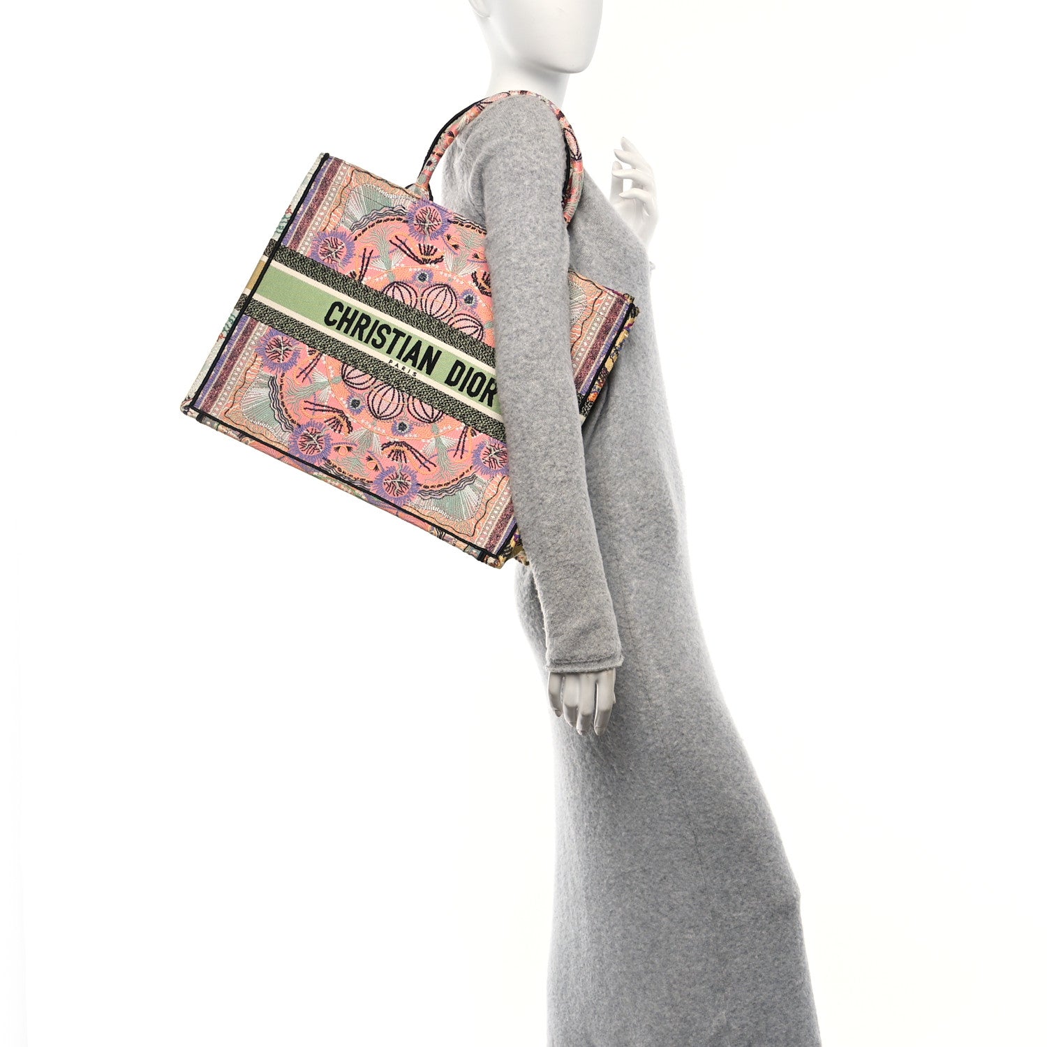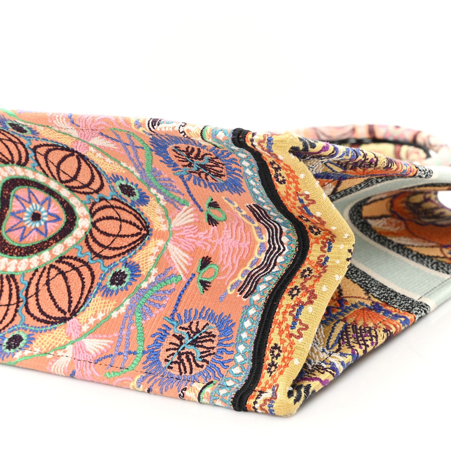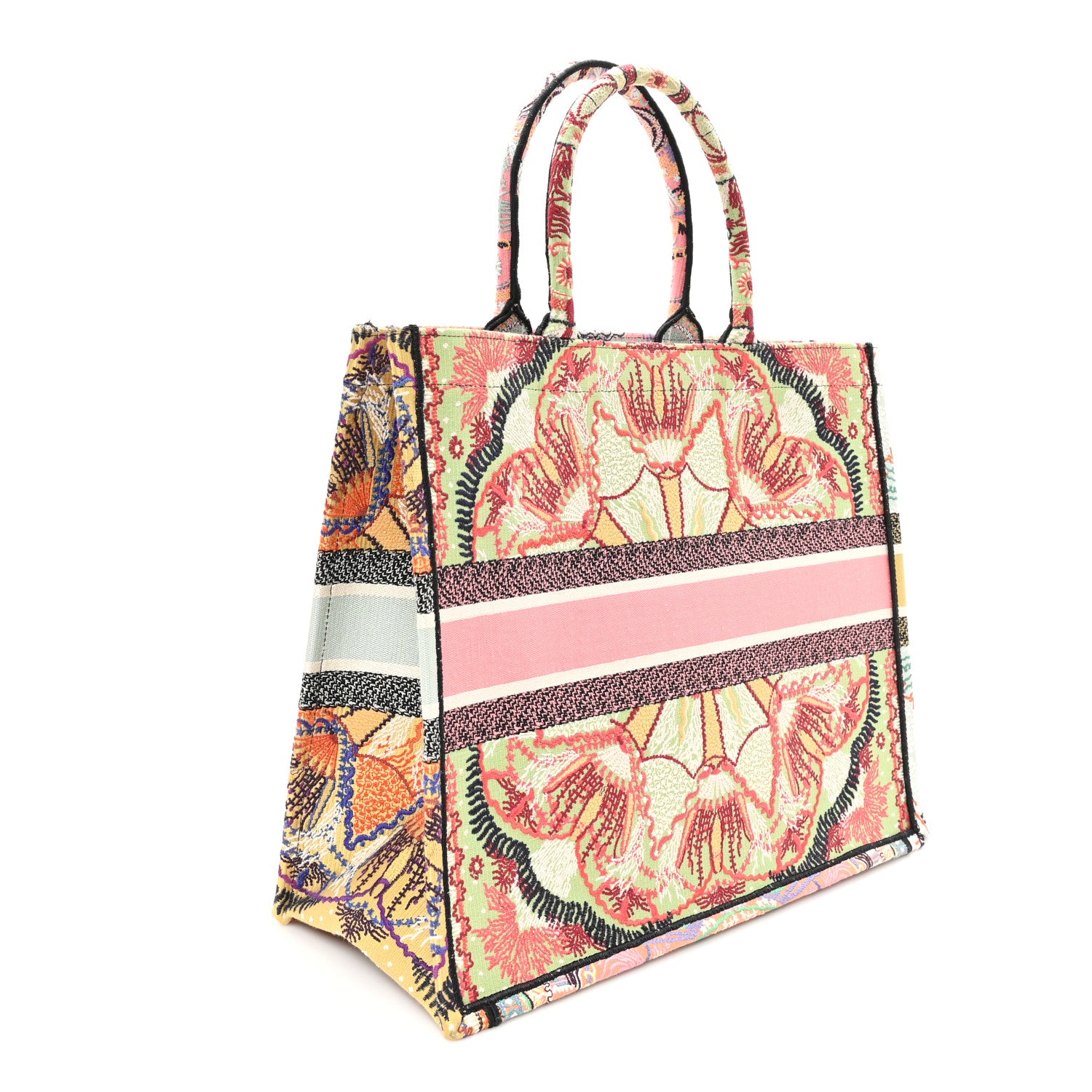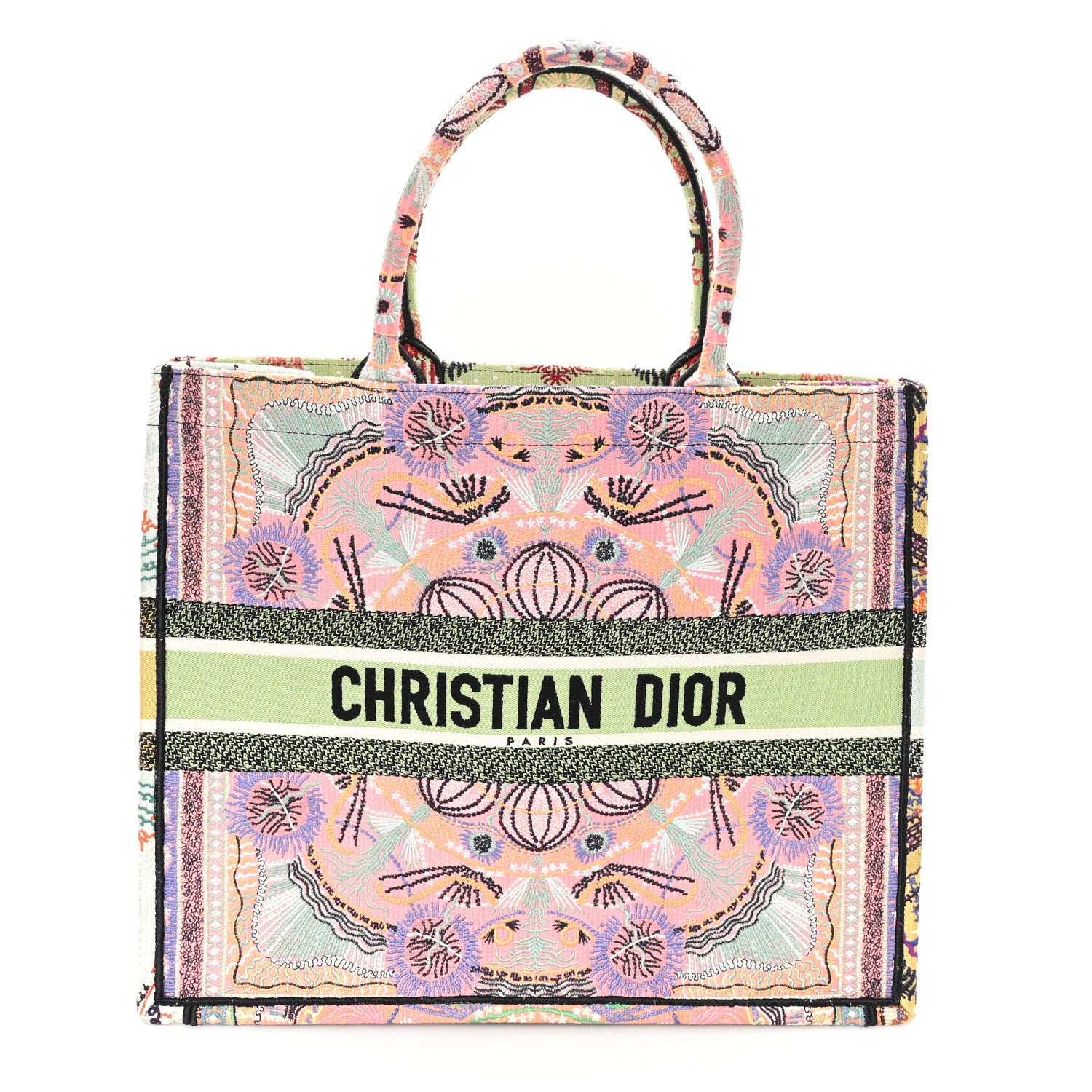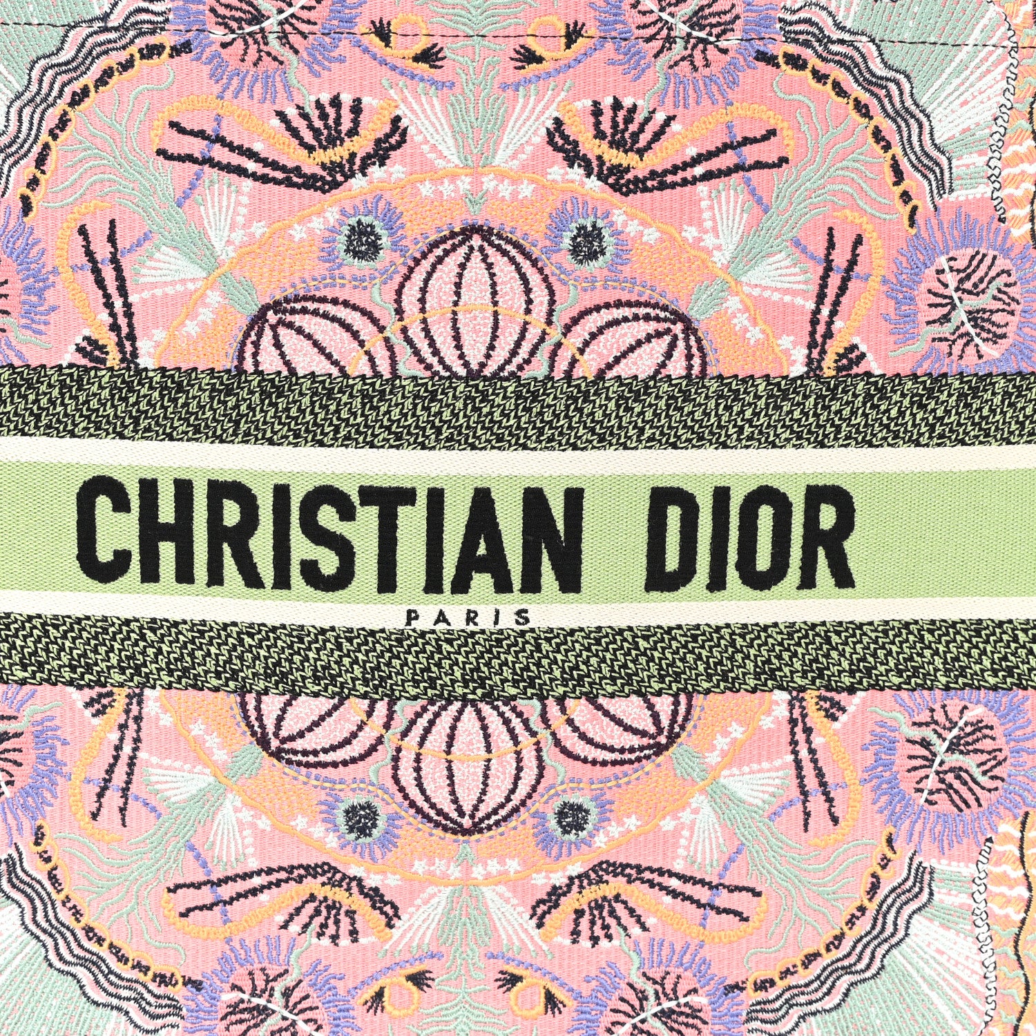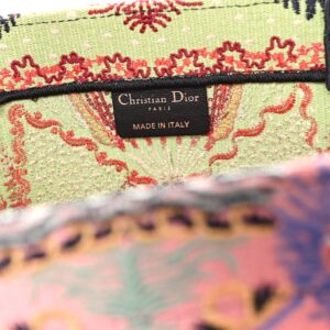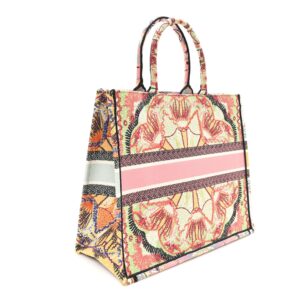 This is an authentic CHRISTIAN DIOR Canvas Embroidered Large In Lights Book Tote in Multicolor. This colorful tote is finely crafted of embroidered canvas with bold graphics on a pink background. The bag features matching rolled canvas handles, with the CHRISTIAN DIOR logo embroidered across the front. The bag opens to a spacious fabric interior.