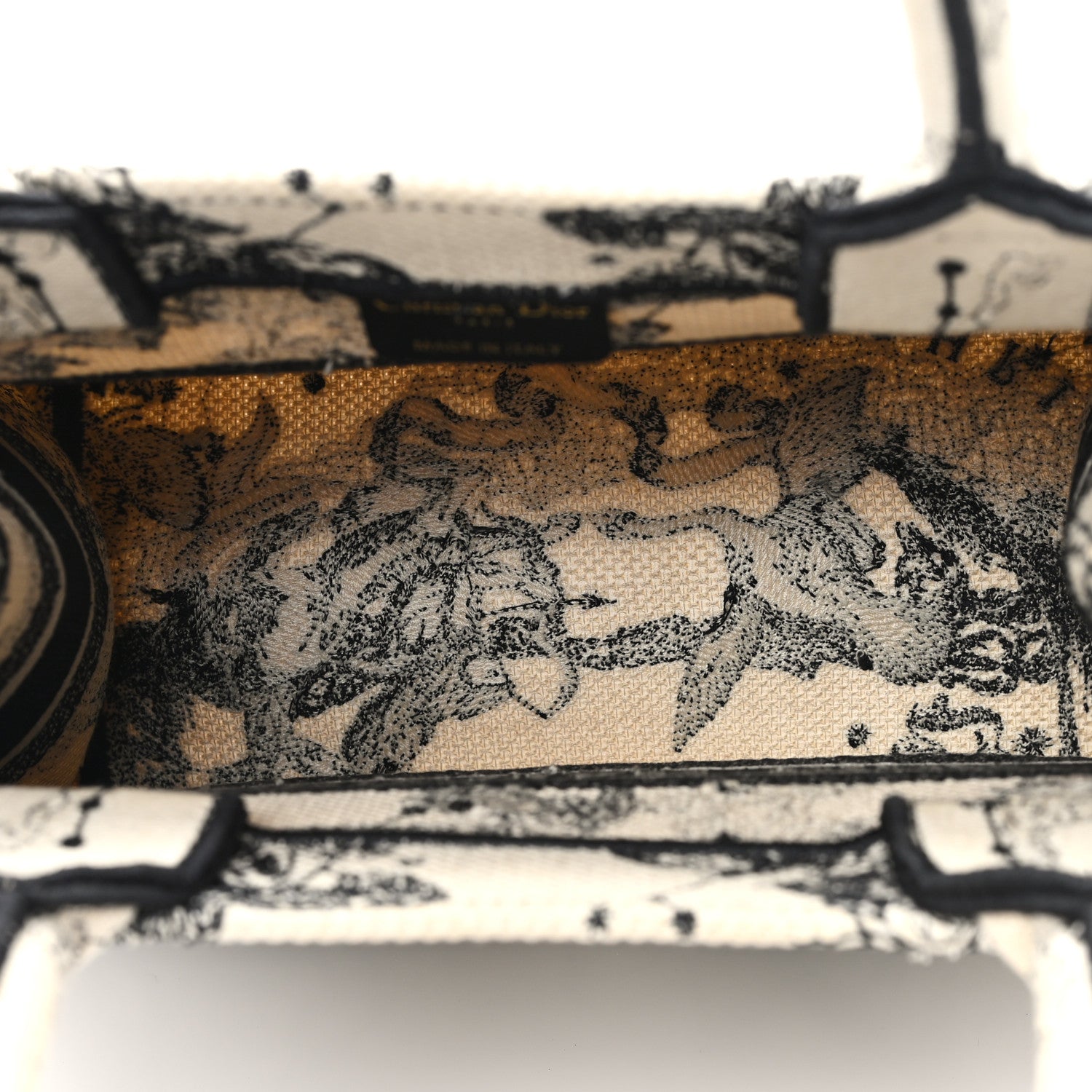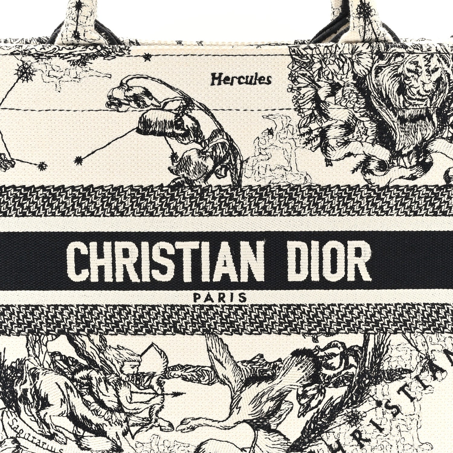This is an authentic CHRISTIAN DIOR Canvas Zodiac Toile De Jouy Embroidered Small Book Tote in Latte. This colorful tote is finely crafted of embroidered canvas with a bold zodiac graphic in black. The bag features matching canvas rolled top handles, with the CHRISTIAN DIOR logo embroidered across the front in white. The bag opens to a spacious unlined fabric interior.