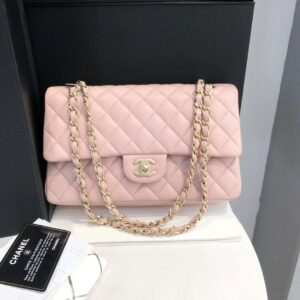 This Medium Classic Double Flap bag is in Light Pink caviar leather with light gold tone hardware and features a front flap with signature CC turnlock closure, half moon back pocket, and adjustable interwoven light gold tone chain link and light pink leather shoulder strap.