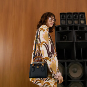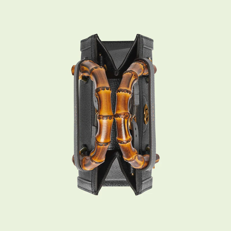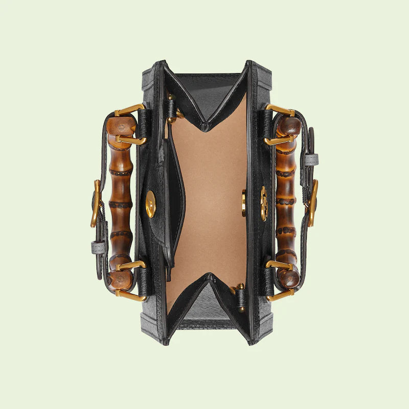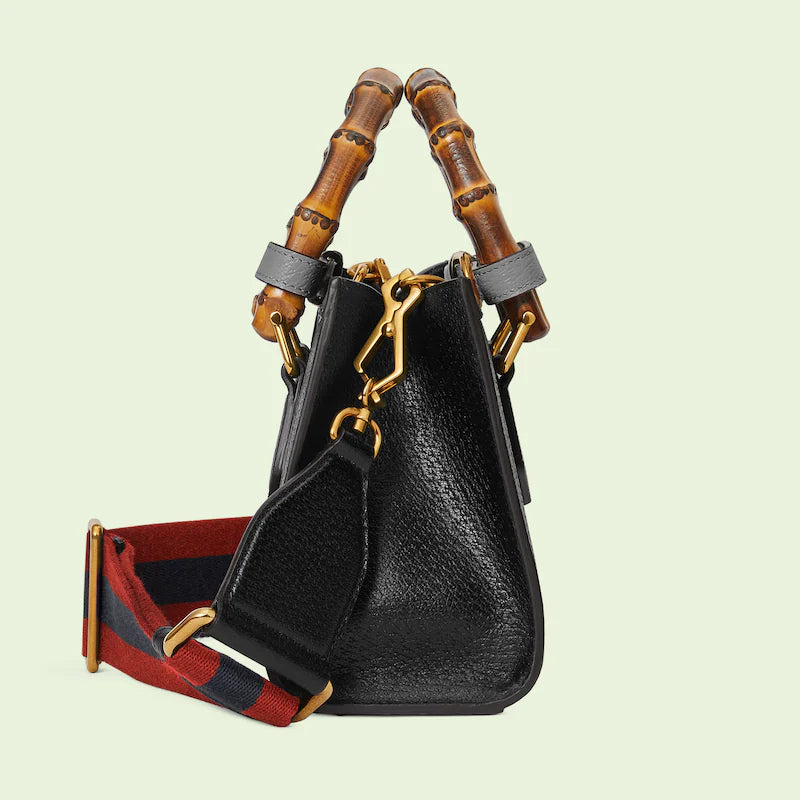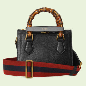 An evolution of a bamboo handle tote first introduced in 1991, the Guthtcci Diana represents the notion of style in constant evolution and is reimagined with removable, neon leather belts��a nod to the functional bands used to keep the handles in shape. Here, a mini version of the emblematic style is presented in black leather.