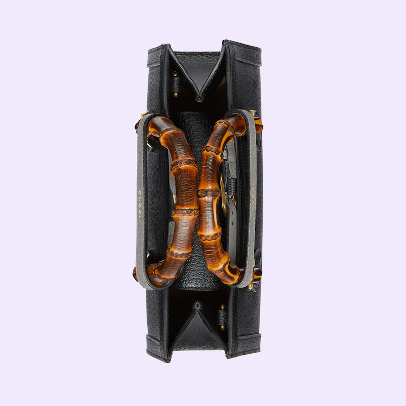 A new shape for Cruise 2023 Guthtcci Cosmogonie, the Guthtcci Diana continues to combine recognizable elements of the House with the bamboo handles and Double G hardware. Crafted from black leather, the accessory is further accentuated by two decorative leather belts, a playful reference to the bands used to keep handles in shape.
