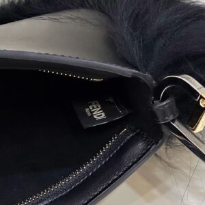 Pouch made of Black leather, embellished with tone on tone fox fur and decorated with Fendi Roma lettering in gold-coloured metal. Zip fastening.