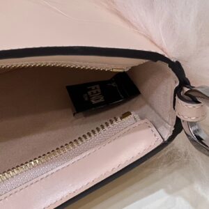 Pouch made of pale pink leather, embellished with tone on tone fox fur and decorated with Fendi Roma lettering in gold-coloured metal. Zip fastening.