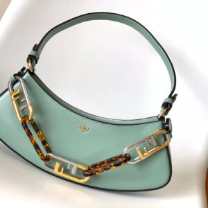 Pouch made of mint green leather with zip closure, decorated with Fendi Roma lettering in gold-coloured metal.