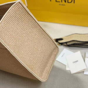 Sunshine Shopper bag made from natural colored straw with FENDI ROMA embroidery and black plexiglass rigid handles.