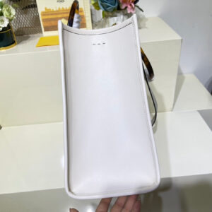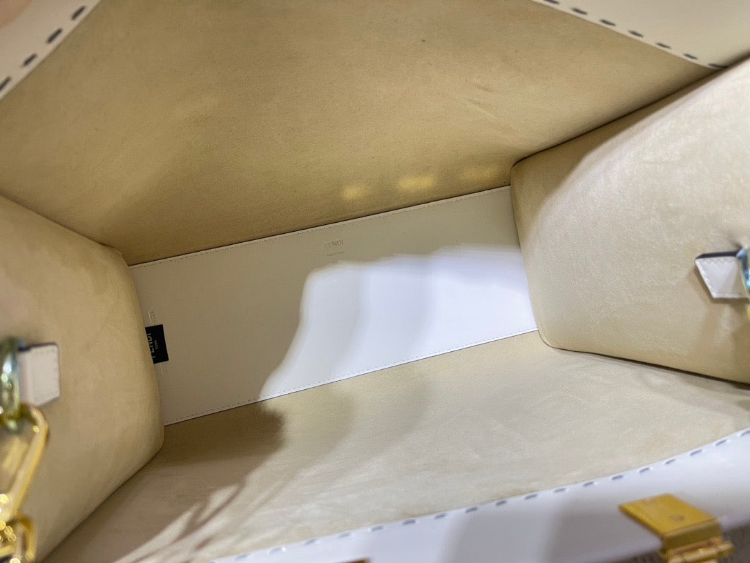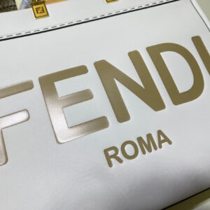 Medium Sunshine Shopper bag made of white leather with hot-stamped “FENDI ROMA�?and stiff tortoiseshell plexiglass handles.
