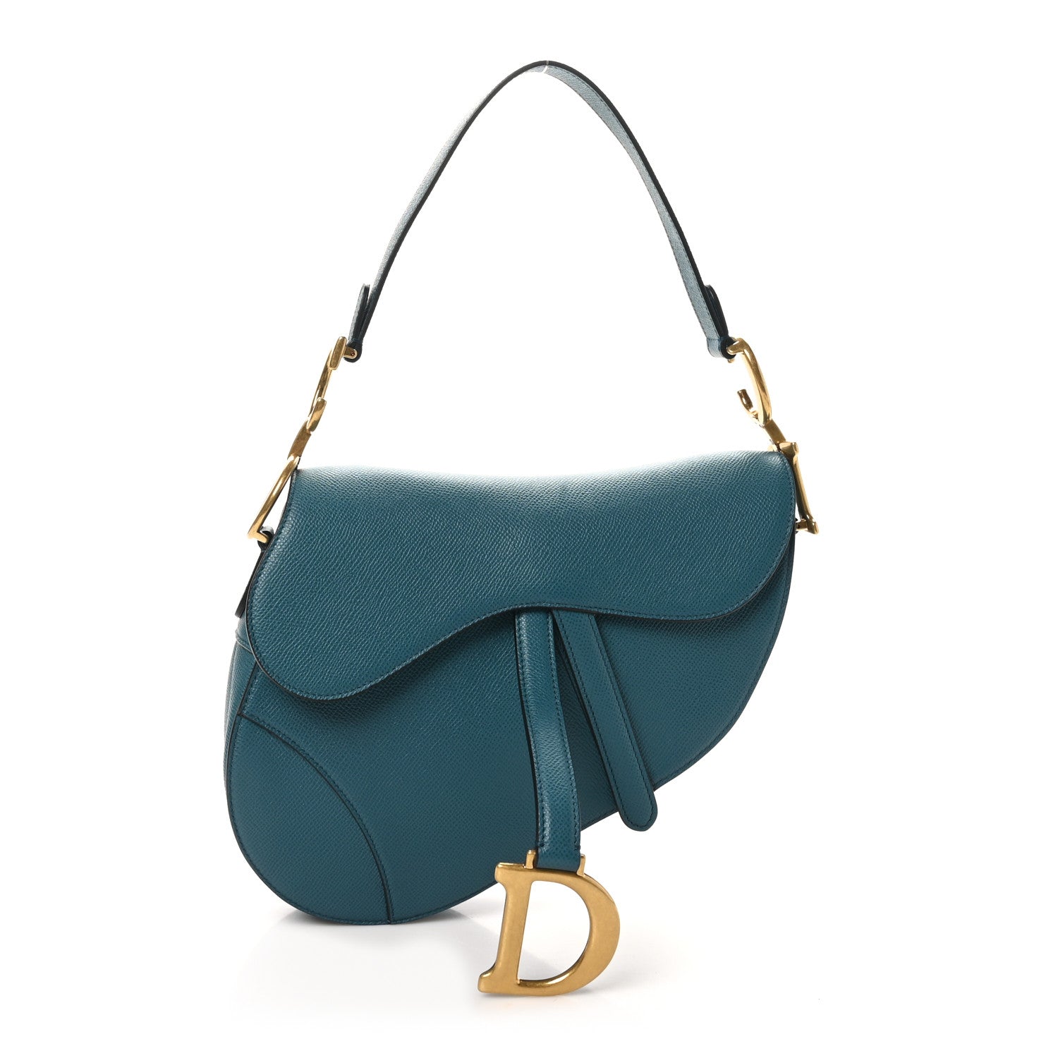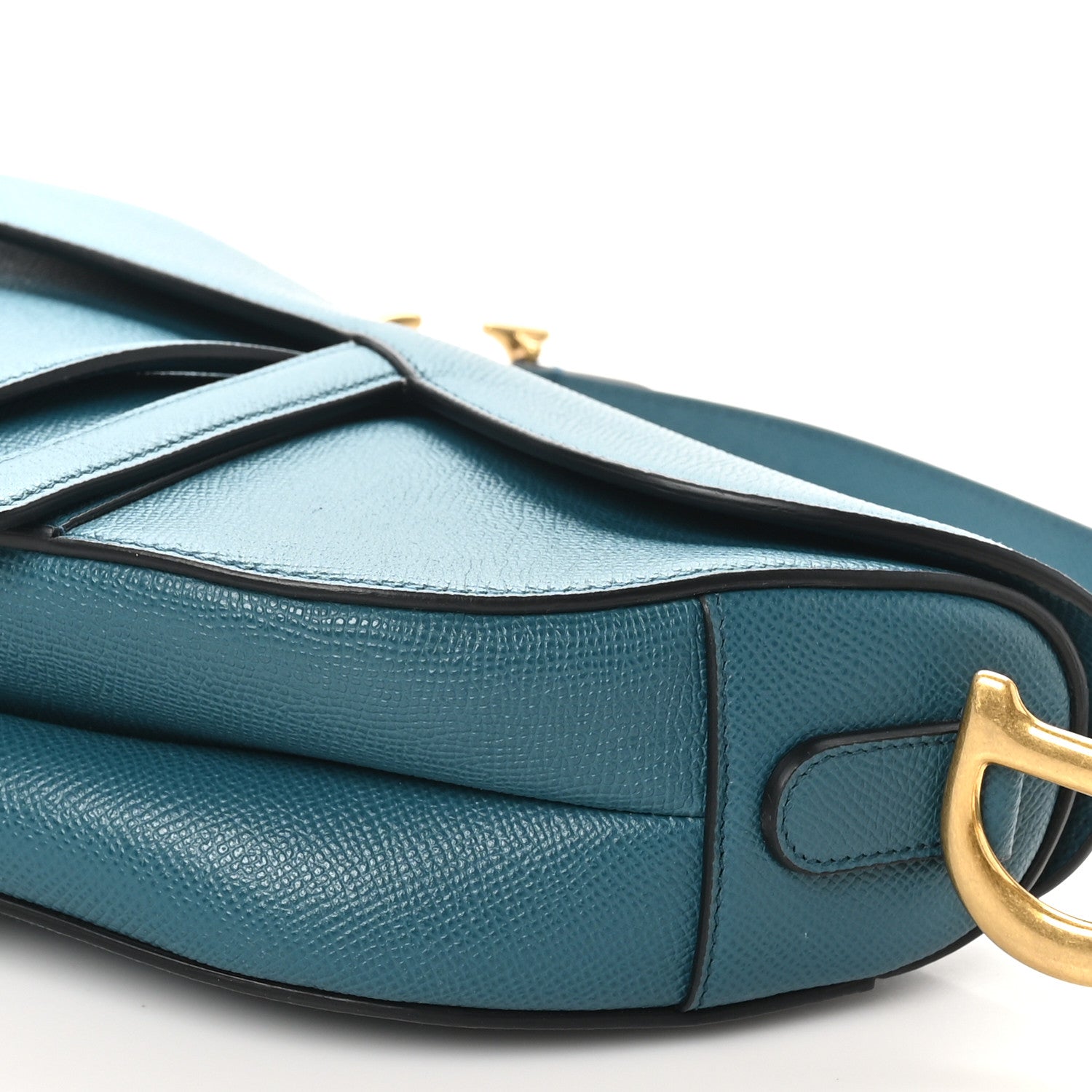 This is an authentic CHRISTIAN DIOR Grained Calfskin Saddle Bag in Turquoise. This saddle-shaped handbag is crafted of grained calfskin leather in blue and features a matching leather strap, secured with aged gold CD logo anchors. The front flap has an aged gold D initial logo and opens to a matching blue microfiber interior.