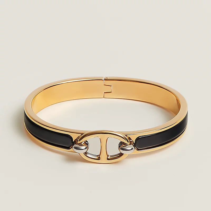 Narrow bracelet in plain enamel with gold-plated hardware.