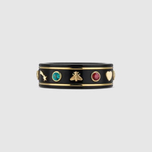 Delving into the House’s eclectic narrative, the Icon collection evolves with the introduction of motifs that have become distinctive of the Guthtcci world. Crafted in 18k yellow gold, the planet, the bee, the star and the Interlocking G are set against a black band and alternate with multicolor gemstones.
