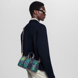 Crafted from striped Monogram Heritage canvas, the Keepall Bandoulière 25 bag is a stylish city bag. A name tag with contrasting stitching echoes the lateral bands and top handles. Pharrell Williams signs the piece with the ‘Marque L. Vuitton Déposée’ emblem, originally seen on the House’s Damier pattern. A detachable striped strap allows for shoulder carry.