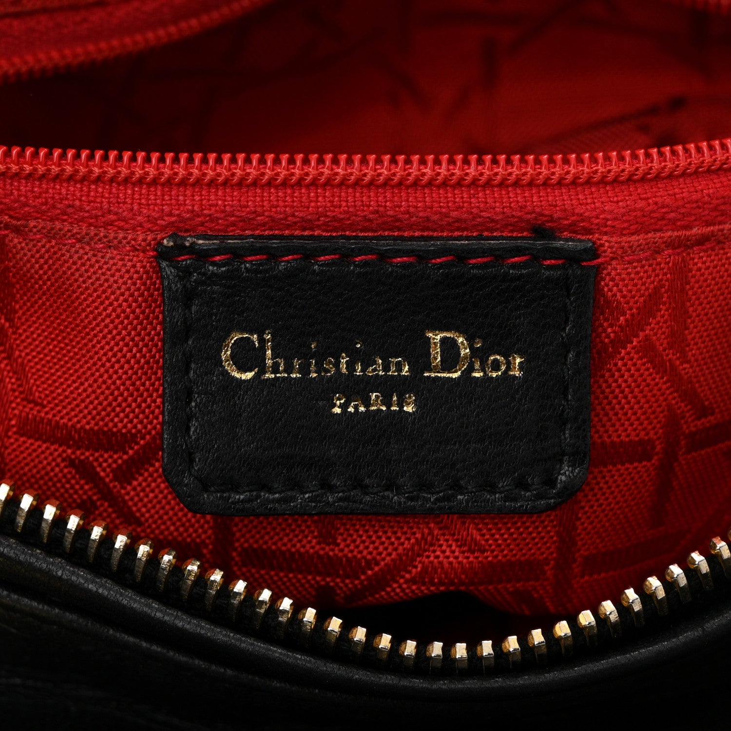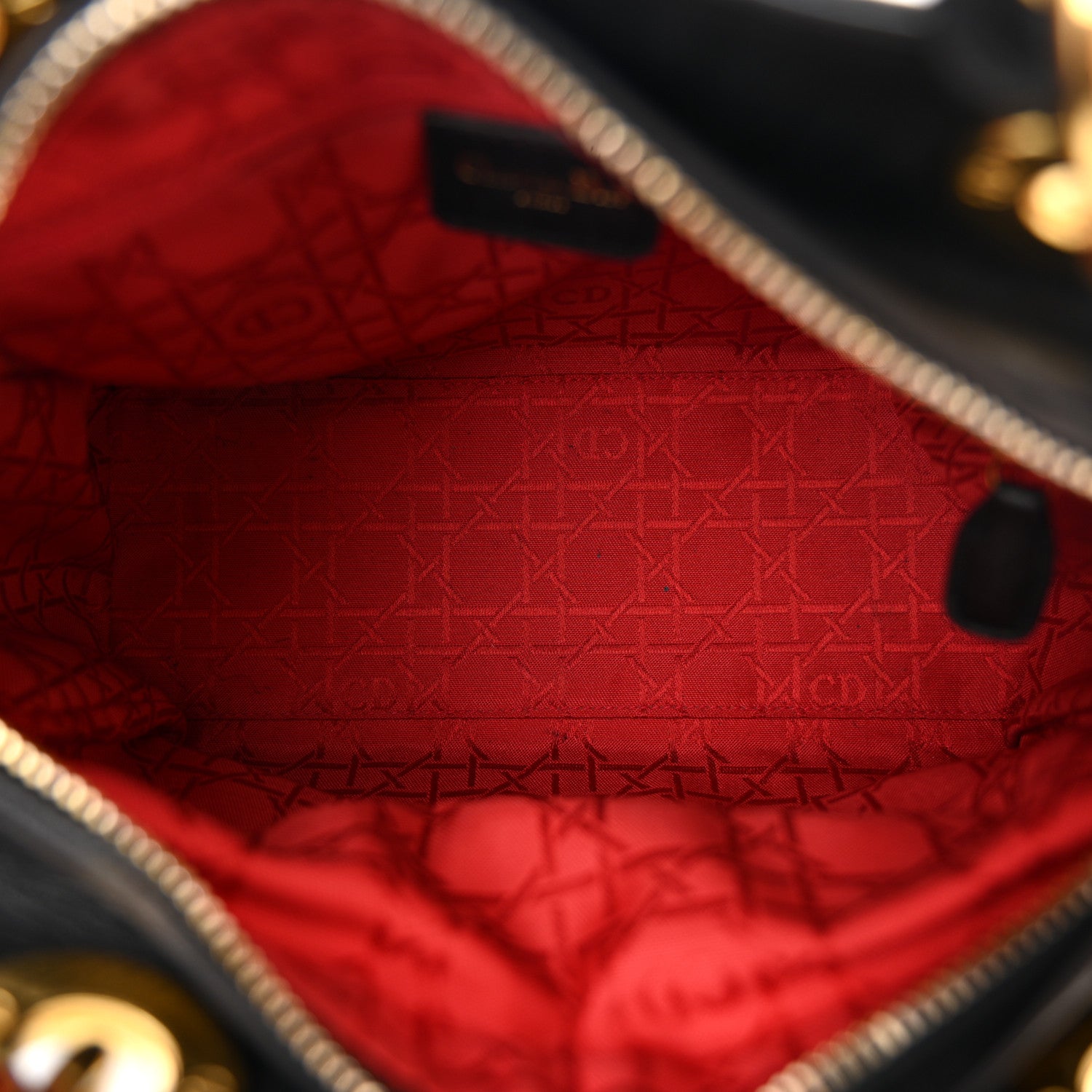 This is an authentic CHRISTIAN DIOR Lambskin Cannage Medium Lady Dior in Black. This chic tote is crafted of black cannage quilted lambskin leather. The bag features leather top handles and polished gold hardware, including a hanging Dior logo charm. The top zipper opens to a red Dior monogram jacquard fabric interior with a zipper pocket.