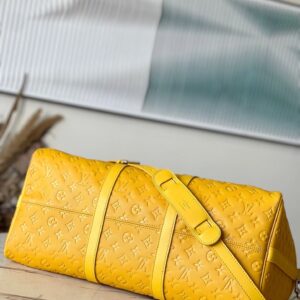 Fashioned from bright-colored Taurillon leather, with the Monogram discreetly embossed into the cowhide, this Keepall Bandouliere 50 travel bag is part of the Travel Rainbow capsule. Lightweight and comfortable to carry, thanks to its removable and adjustable strap, it features an inside zipped pocket in a matching colorway.
