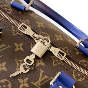 The Keepall Bandouliere 50 travel bag is made from Monogram Macassar canvas with colored-leather top handles, lateral bands, and name tag. The inside is lined with textile in the same bright color for a bag that’s as joyful as it is functional. The generously sized Keepall 50 can be brought onto the plane as carry-on luggage.