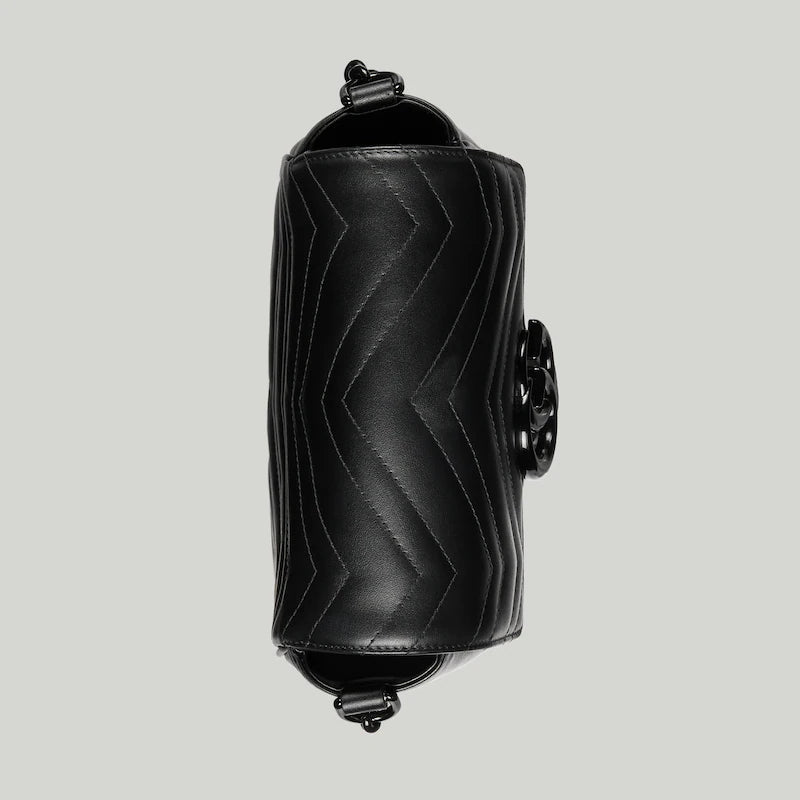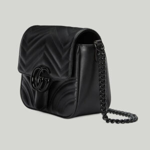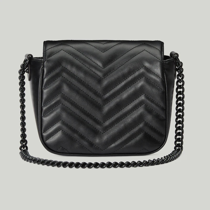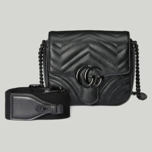 With its recognizable matelass�� fabric and Double G hardware, the GthtG Marmont has become synonymous with the House. Continuously reinvented through the seasons, new shapes are introduced within this signature line, matching Guthtcci’s contemporary vision. Crafted in black leather, this structured mini shoulder bag is defined by a tonal buckle and chain, exploring rich textures and geometric forms.