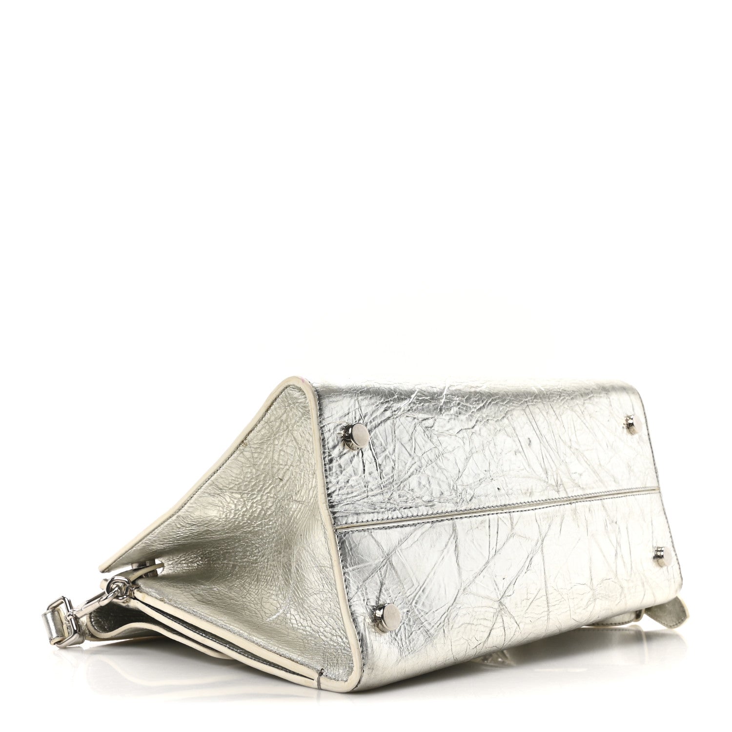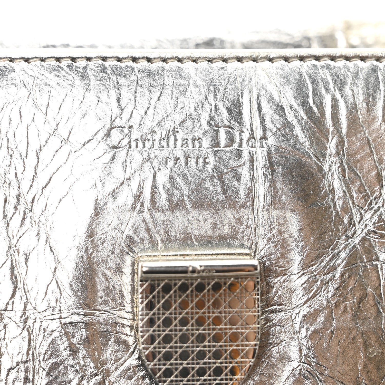 This is an authentic CHRISTIAN DIOR Metallic Calfskin Medium Diorever Flap in Silver. This chic handbag is crafted of crushed calfskin leather in metallic silver. This handbag features white rolled leather top handles, a metallic silver shoulder strap, and silver hardware. The facing flap opens with a textured press lock to a metallic silver calfskin interior with pockets.