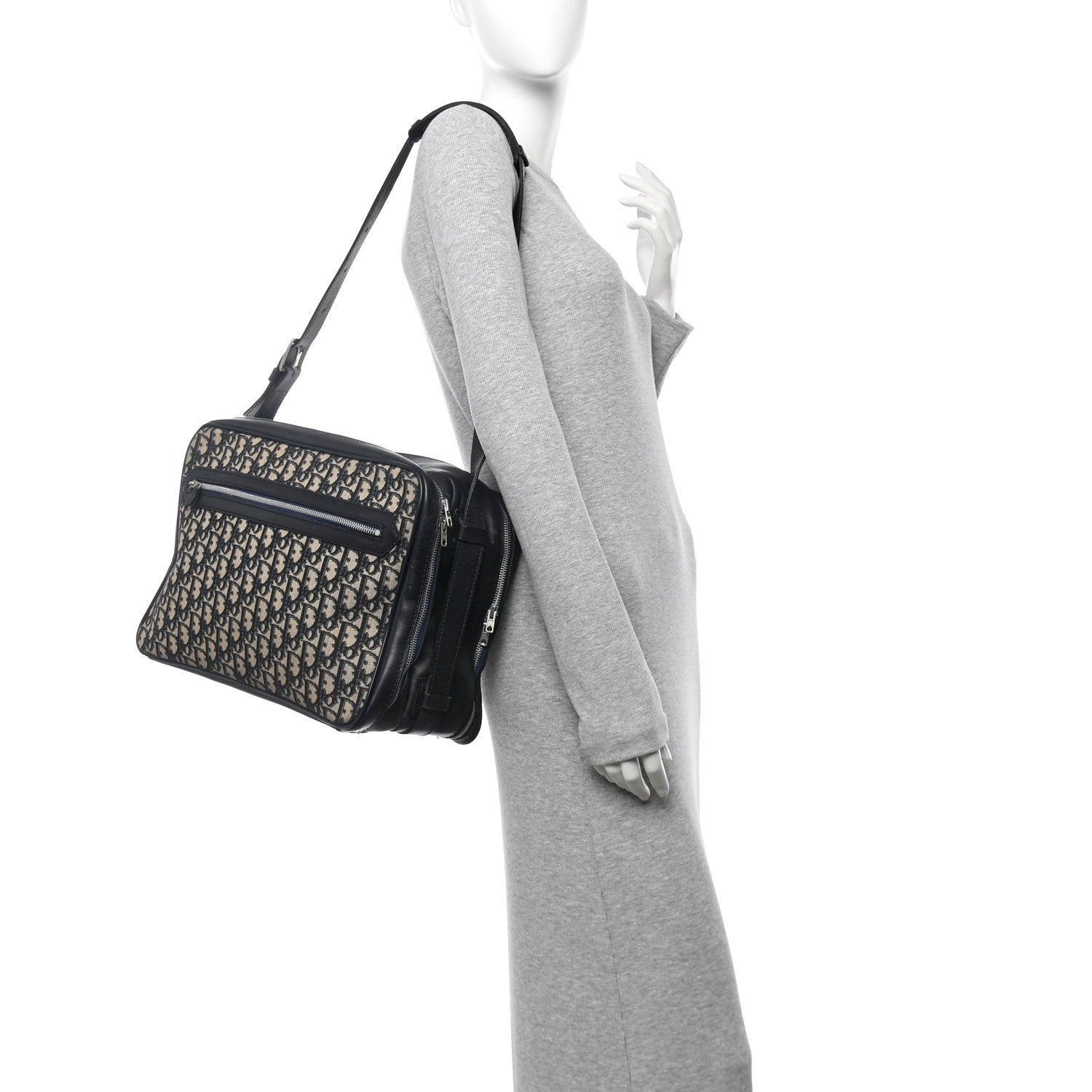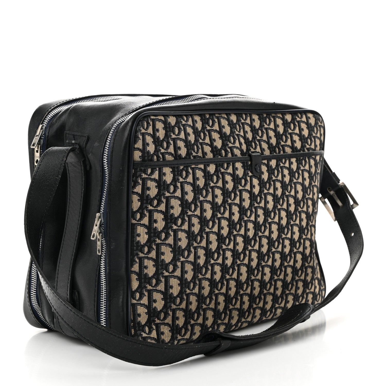 This is an authentic CHRISTIAN DIOR HOMME Oblique Messenger in Blue. This messenger bag is made of navy on beige Dior monogram canvas. The bag features a front zipper pocket, and an adjustable blue leather shoulder strap. The top zippers open to a beige fabric interior.
