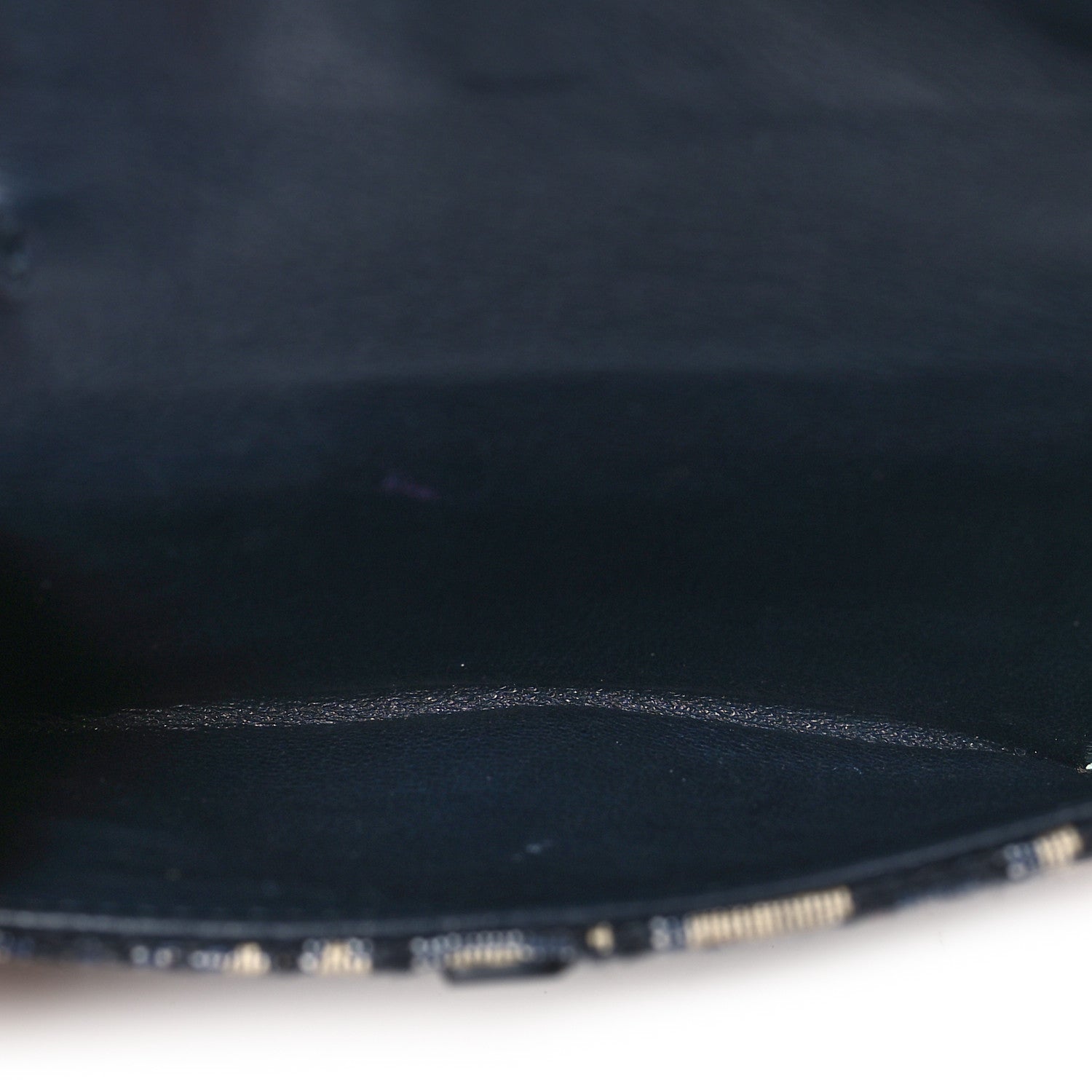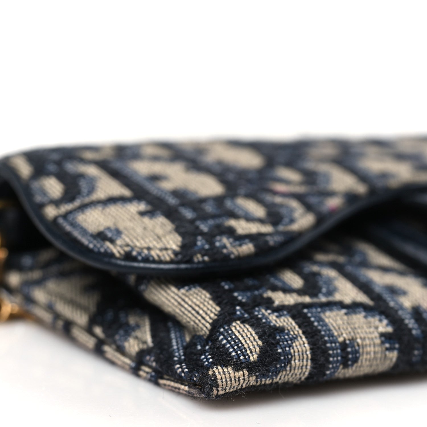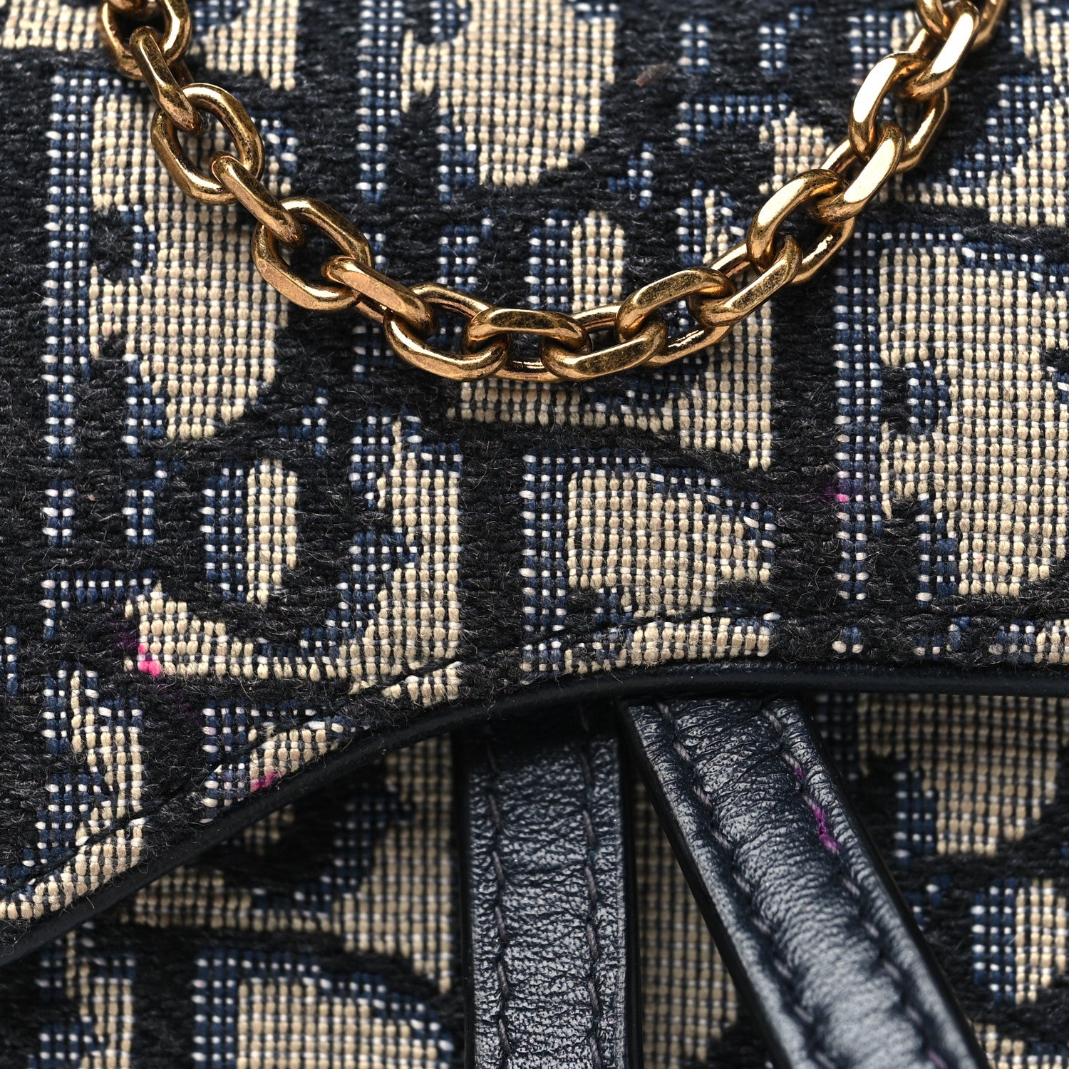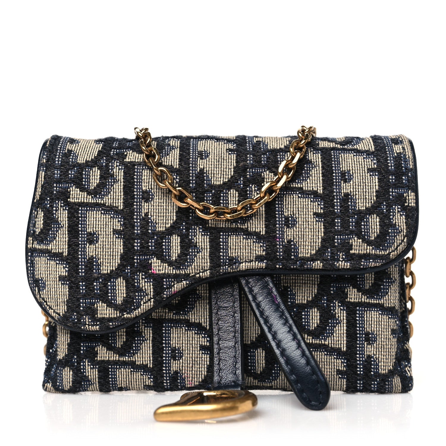 This is an authentic CHRISTIAN DIOR Oblique Nano Saddle Chain Pouch in Blue. This chain pouch is finely crafted of navy blue on beige Dior monogram canvas. The bag features an aged gold chain shoulder strap and a hanging “D” charm. The magnetic top flap opens to a navy leather interior.