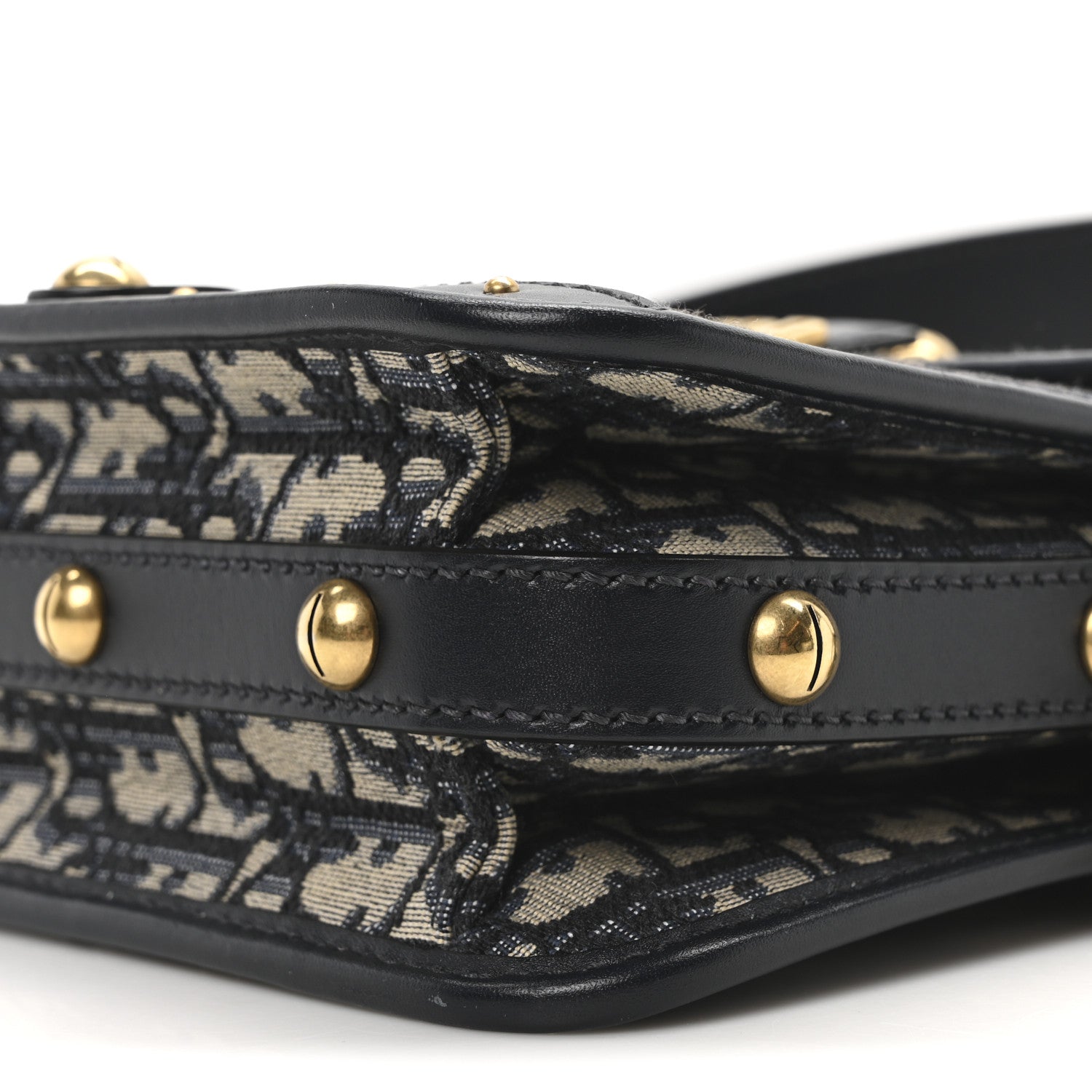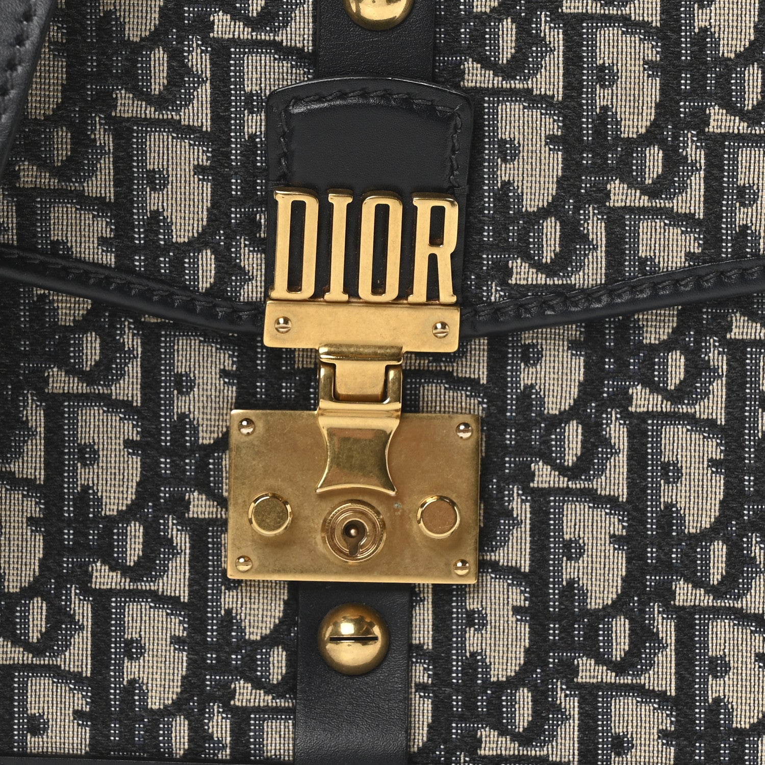 This is an authentic CHRISTIAN DIOR Oblique DiorAddict Square Flap in Navy Blue. This flap bag is finely crafted of navy on beige Dior monogram canvas. The bag features navy cowhide leather trim, a brass chain shoulder strap and aged brass hardware. The flap opens to a natural linen interior with zipper and patch pockets.