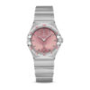 To give the bezel an extra pop of colour, OMEGA has highlighted the engraved Roman numerals in the same pastel shade.