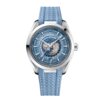 This 43 mm Worldtimer, with its case in polished and brushed stainless steel, has a matching bracelet.The dial is sun-brushed in OMEGA’s own Summer Blue with a gradient finish to reflect the watch’s level of water resistance and includes vertical teak stripes and rhodium-plated hands and indexes filled with a unique light blue Super-LumiNova.Around the dial is a circle of silvery printed global destinations. The centre contains a 24-hour glass ring, with light blue to indicate daytime and dark blue to indicate night. The vision of Earth, which depicts a blue ocean and relief of the continents, is laser-ablated on a grade 5 titanium plate.Turning the watch over reveals a stamped commemorative Seamaster logo depicting a trident-bearing Poseidon and two seahorses: OMEGA’s 1956 original and the brand’s current design. Behind which sits the Co-Axial Master Chronometer Calibre 8938.