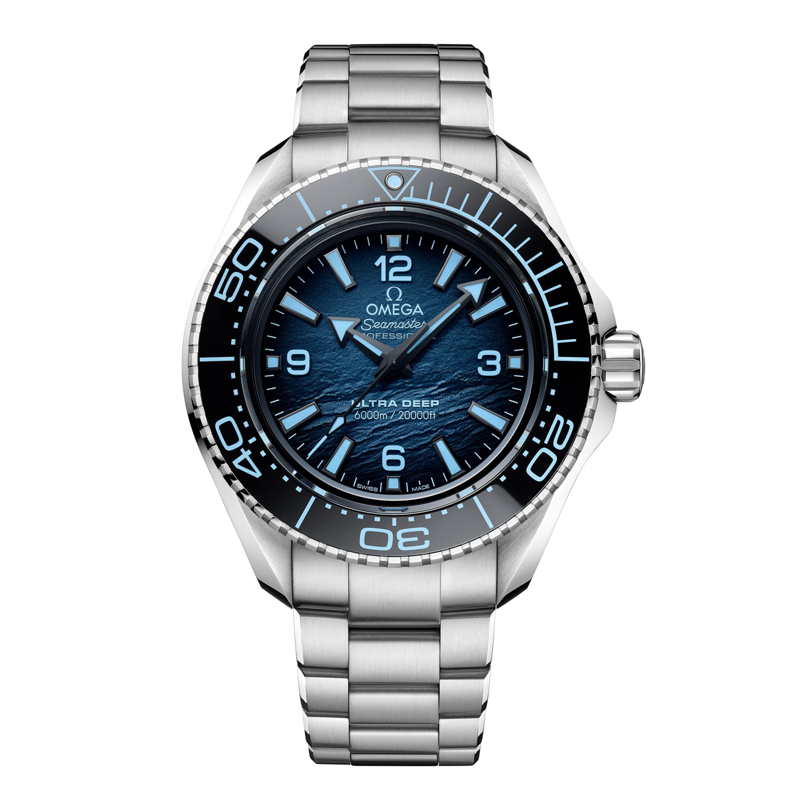 As part of the Five Deeps Expedition in 2019, the Ultra Deep concept watch made history when it reached the deepest place on Earth. Following that World Record dive, OMEGA produced a collection for everyday adventurers. A watch tested in real ocean conditions during its development, water-resistant to 6,000 metres (20,000 ft.), and meeting the ISO 6425:2018 standard for saturation divers’ watches, as certified by the Swiss Federal Institute of Metrology (METAS).This 45.5 mm model has a case and bracelet in robust O-MEGASTEEL and an extraordinary dial that pays homage to the mysteries of the deep. Its pattern is an accurate representation of the bottom of the Challenger Deep, the deepest point in the Mariana Trench, mapped by the Five Deeps team using almost one million sonar points. Its lacquered finish, produced by letting an ocean of lacquer flow across the dial, has a beautiful sense of depth. The dial even has a playful side. Shining a UV light reveals the words, OMEGA WAS HERE, pointing toward the world record dive of 10,935 metres (35,876 ft.) and showing the Western, Central and Eastern Pools.The caseback has a laser-engraved commemorative Seamaster logo depicting a trident-bearing Poseidon and two seahorses: OMEGA’s 1956 original and the brand’s current design. Behind which sits the OMEGA Co-Axial Master Chronometer calibre 8912.