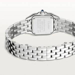 Panthère de Cathtrtier watch, small model, quartz movement. Steel case, bezel set with 36 brilliant-cut diamonds totaling 0.24 carat. Dimensions: 22 mm x 30 mm, thickness: 6 mm, crown set with a blue synthetic spinel, dial with graded shades of blue and navy forming a diagonal in the center, sword-shaped hands, steel strap. Water-resistant up to 3 bar (approx. 30 meters/100 feet).