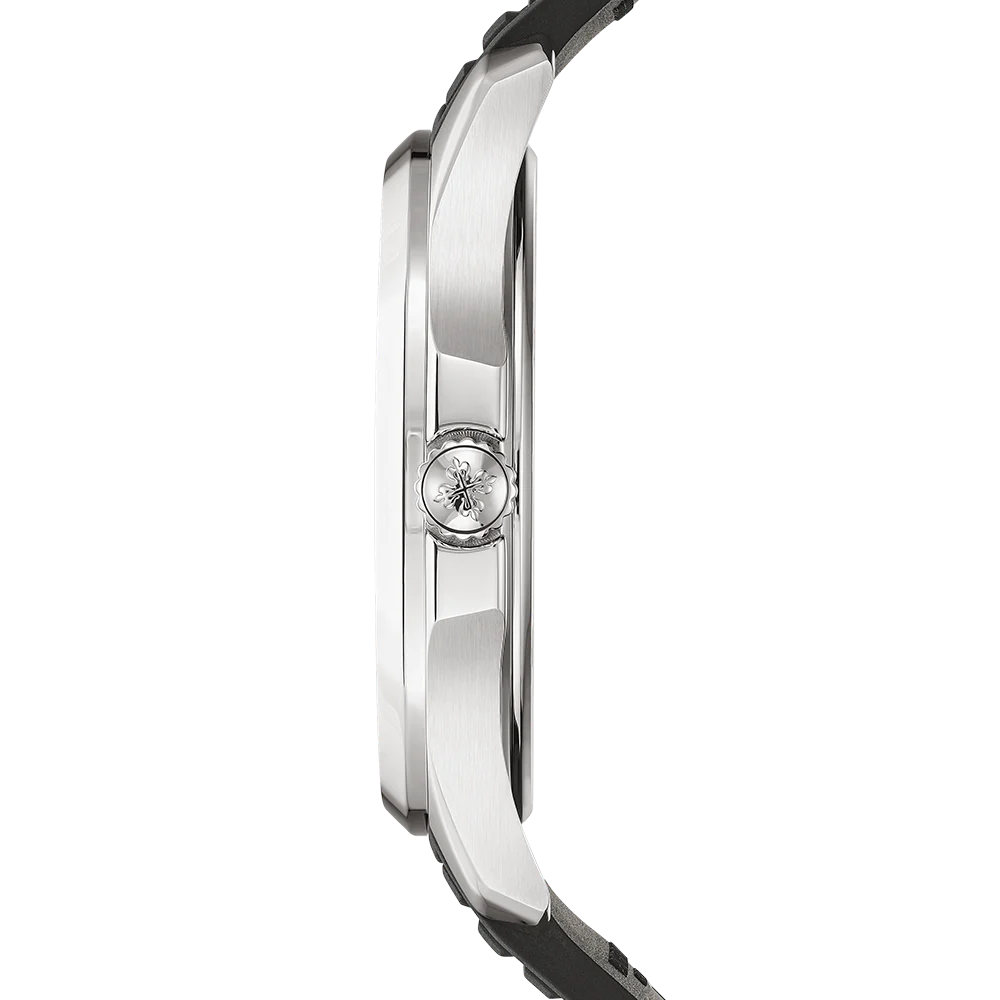 Patek Philippe reinterprets the quartz Aquanaut Luce in stainless steel with a larger diameter (38.8 mm) and a new integrated composite strap. This epitome of contemporary casual chic is attired in an elegant shade of black adorning the dial and matching strap. Water-resistant to 120m, the rounded octagonal case is enhanced by polished and satin finishes. The bezel is lit up by a row of 48 diamonds (~1.11 ct). The patented folding clasp is secured by four independent catches.