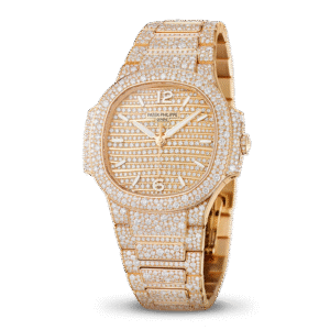 The Nautilus Haute Joaillerie appears in this rose gold version, entirely paved with diamonds snow-set on the case, bezel and bracelet. On the dial, the rows of stones are set in the small raised wave pattern typical of the Ladies` Nautilus collection.? To ensure perfect readability, this watch is fitted with luminescent-coated hands, applied hour-markers and Arabic numerals.? The rose gold case houses a self-winding caliber visible through a transparent sapphire crystal case-back.? The Nautilus Haute Joaillerie sparkles with the fire of 2,553 brilliant-cut internally flawless Top Wesselton (~12.69 cts).