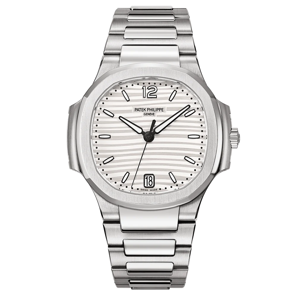 The Ladies Automatic Nautilus wristwatch in stainless steel emphasizes its casual elegance and very feminine style with a new silvery opaline dial colour. The gently undulating embossed decor underscores its unmistakably ladylike interpretation of the Nautilus. The applied numerals and the hands are luminous to assure optimized legibility.