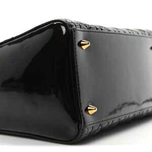 This is an authentic CHRISTIAN DIOR Patent Cannage Medium Lady Dior in Black. This chic tote is crafted of geometric quilted patent leather in black. The handbag features an optional adjustable shoulder strap, sturdy patent leather top handles with gold hardware, and hanging Dior logo charms. The top zipper opens to a gray monogrammed fabric interior with a zipper pocket.