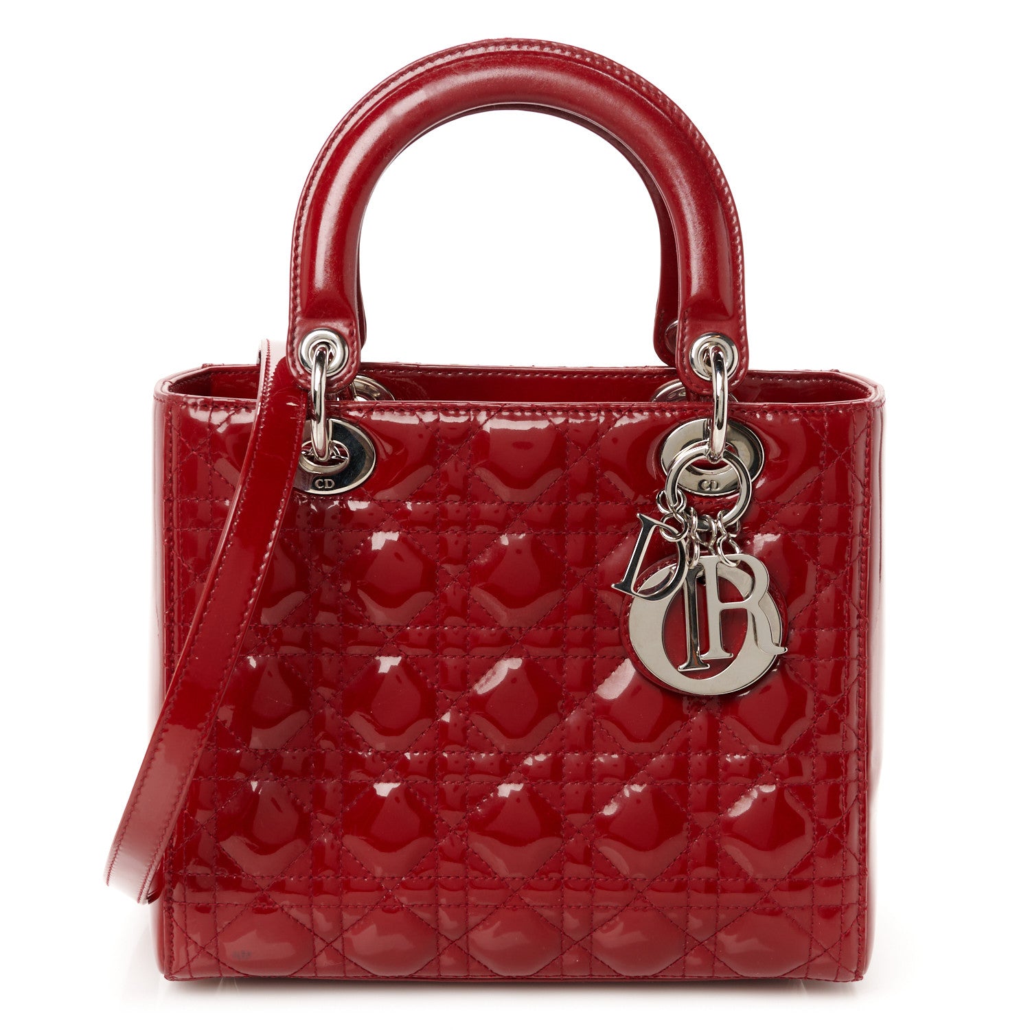 This is an authentic CHRISTIAN DIOR Patent Cannage Medium Lady Dior in Red. This tote is crafted of geometric quilted patent leather in red. The bag features sturdy leather top handles and polished silver hardware including hanging Dior initials logo charms. The top zipper opens to a red Dior monogram jacquard fabric interior with zipper and patch pockets.