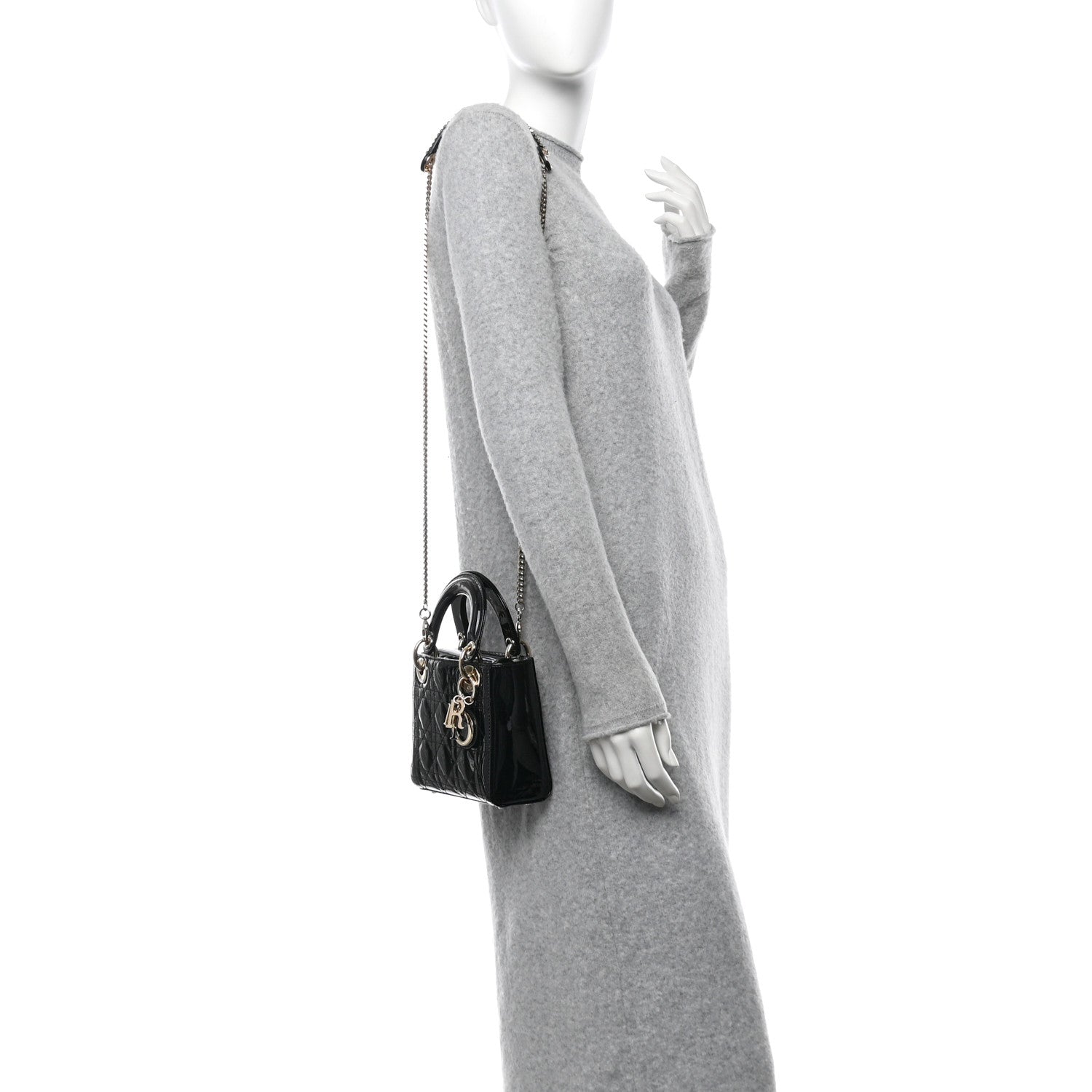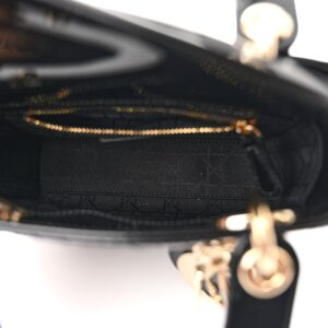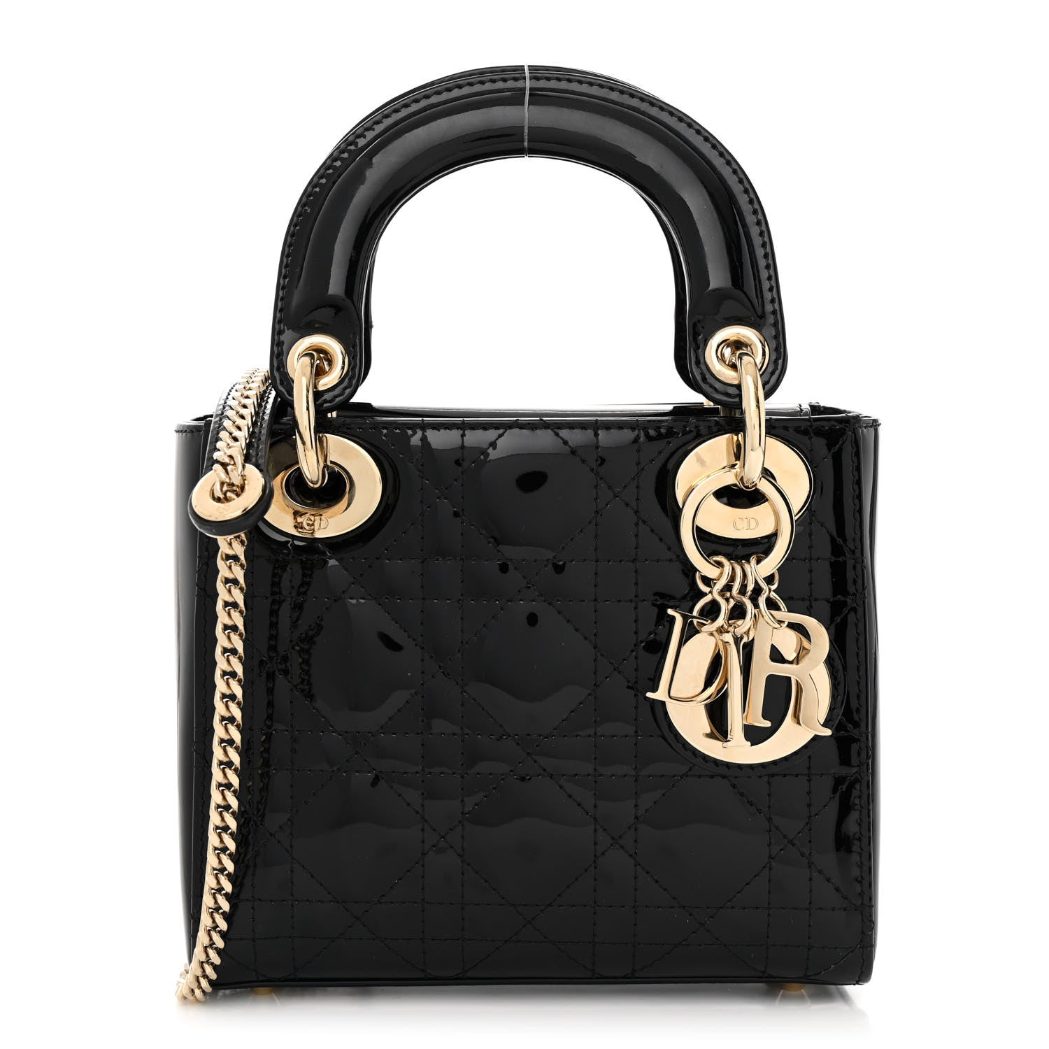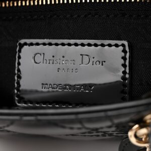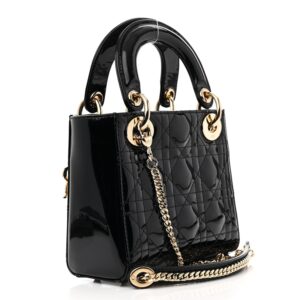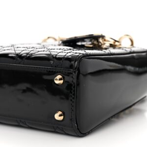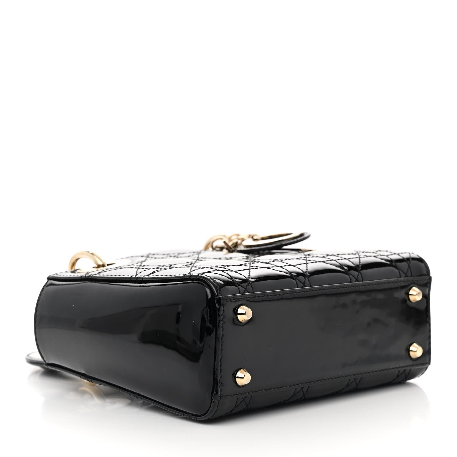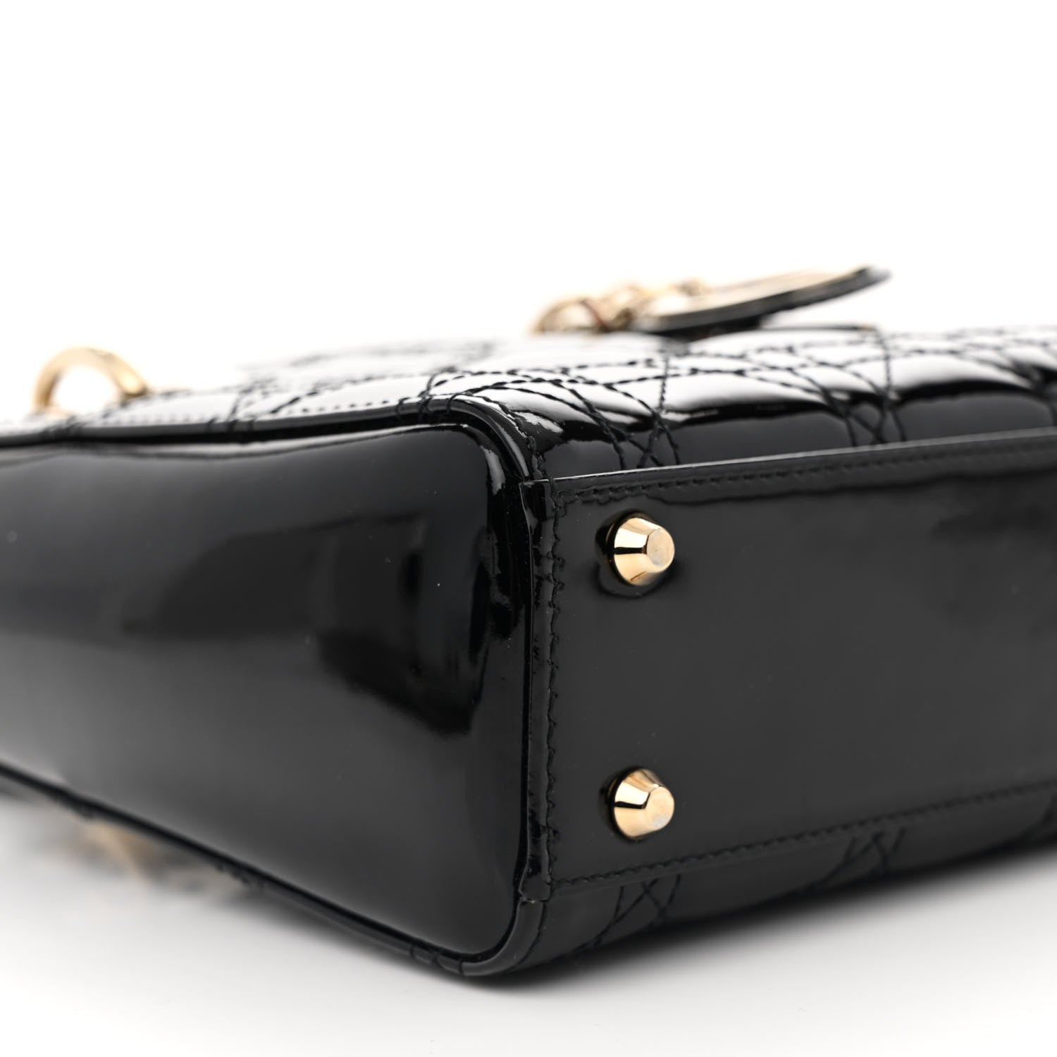 This is an authentic CHRISTIAN DIOR Patent Cannage Mini Lady Dior in Black. This mini tote is crafted of black patent leather with a geometric quilted design. The bag features smooth black patent leather top handles, a hanging “Dior” charm, and a removable chain strap with black leather shoulder pad and gold chain detail. The top flap opens to a black patterned fabric interior with a zipper pocket.